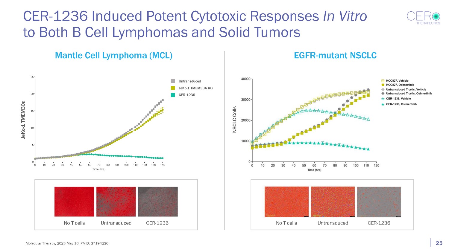 CER - 1236 Induced Potent Cytotoxic Responses In Vitro to Both B Cell Lymphomas and Solid Tumors Mantle Cell Lymphoma (MCL) EGFR - mutant NSCLC NSCLC Cells JeKo - 1 TMEM30a 0 10 20 30 40 50 60 80 90 100 110 120 130 140 0 5 10 15 20 25 70 Time (hrs) No T cells Untransduced CER - 1236 No T cells Untransduced CER - 1236 Untransduced JeKo - 1 TMEM30A KO CER - 1236 25 Molecular Therapy, 2023 May 16. PMID: 37194236.