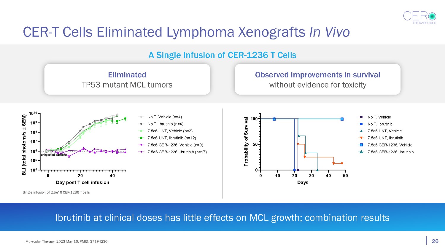 CER - T Cells Eliminated Lymphoma Xenografts In Vivo A Single Infusion of CER - 1236 T Cells Single infusion of 2.5e^6 CER - 1236 T cells Eliminated TP53 mutant MCL tumors Observed improvements in survival without evidence for toxicity 0 40 10 4 10 5 10 6 10 7 10 8 10 9 10 10 20 Day post T cell infusion BLI (total photons/s SEM) No T, Vehicle (n=4) No T, Ibrutinib (n=4) 7.5e6 UNT, Vehicle (n=3) 7.5e6 UNT, Ibrutinib (n=12) 7.5e6 CER - 1236, Vehicle (n=9) 7.5e6 CER - 1236, Ibrutinib (n=17) uninjected baseline 0 10 20 30 40 50 0 50 100 Days Probability of Survival No T, Vehicle No T, Ibrutinib 7.5e6 UNT, Vehicle 7.5e6 UNT, Ibrutinib 7.5e6 CER - 1236, Vehicle 7.5e6 CER - 1236, Ibrutinib Ibrutinib at clinical doses has little effects on MCL growth; combination results 26 Molecular Therapy, 2023 May 16. PMID: 37194236.