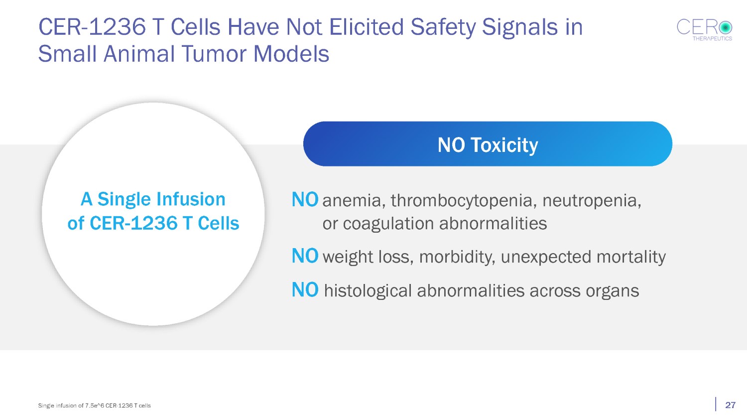 CER - 1236 T Cells Have Not Elicited Safety Signals in Small Animal Tumor Models 27 Single infusion of 7.5e^6 CER - 1236 T cells NO anemia, thrombocytopenia, neutropenia, or coagulation abnormalities NO weight loss, morbidity, unexpected mortality NO histological abnormalities across organs A Single Infusion of CER - 1236 T Cells NO Toxicity