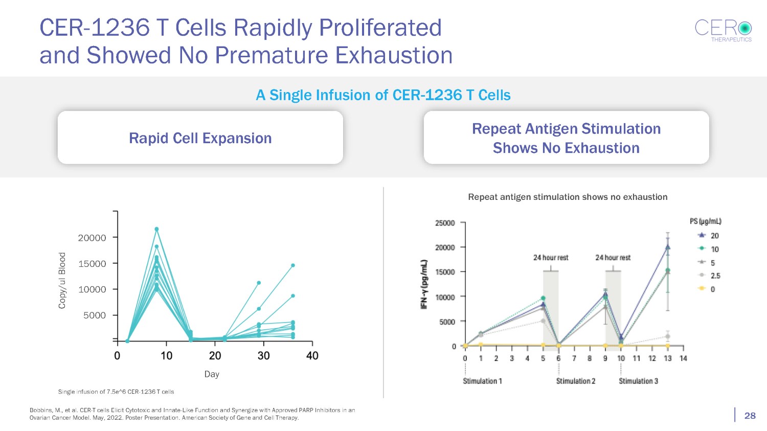 CER - 1236 T Cells Rapidly Proliferated and Showed No Premature Exhaustion 28 A Single Infusion of CER - 1236 T Cells Rapid Cell Expansion Repeat Antigen Stimulation Shows No Exhaustion Single infusion of 7.5e^6 CER - 1236 T cells Copy/ul Blood Day 20000 15000 10000 5000 Repeat antigen stimulation shows no exhaustion Bobbins, M., et al. CER - T cells Elicit Cytotoxic and Innate - Like Function and Synergize with Approved PARP Inhibitors in an Ovarian Cancer Model. May, 2022. Poster Presentation. American Society of Gene and Cell Therapy.