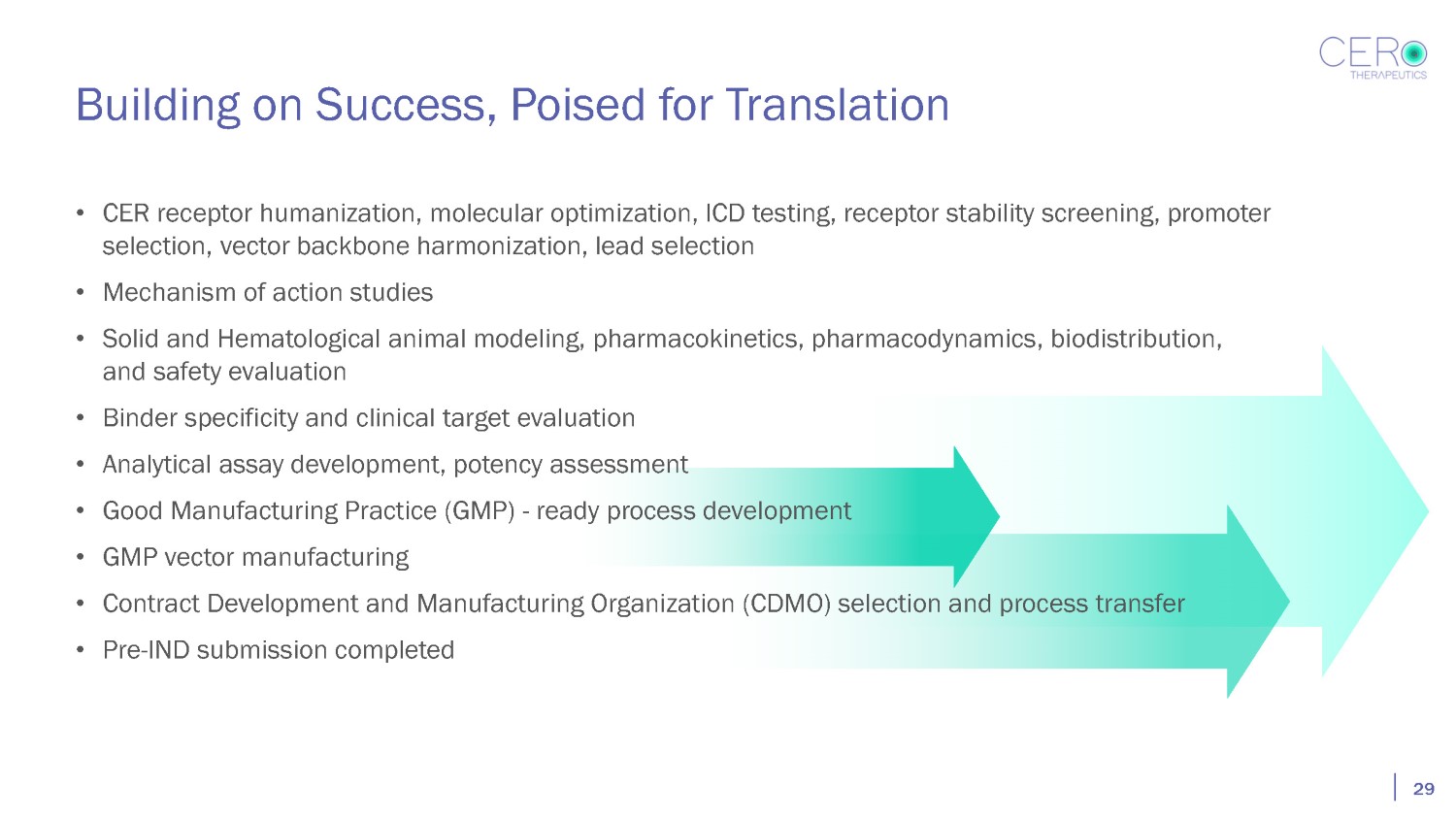 Building on Success, Poised for Translation • CER receptor humanization, molecular optimization, ICD testing, receptor stability screening, promoter selection, vector backbone harmonization, lead selection • Mechanism of action studies • Solid and Hematological animal modeling, pharmacokinetics, pharmacodynamics, biodistribution, and safety evaluation • Binder specificity and clinical target evaluation • Analytical assay development, potency assessment • Good Manufacturing Practice (GMP) - ready process development • GMP vector manufacturing • Contract Development and Manufacturing Organization (CDMO) selection and process transfer • Pre - IND submission completed 29
