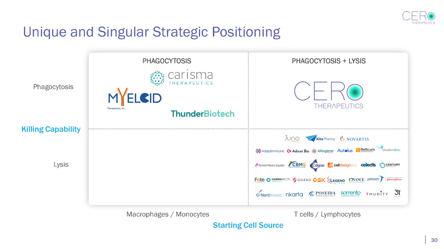 Unique and Singular Strategic Positioning Killing Capability Starting Cell Source T cells / Lymphocytes Macrophages / Monocytes Phagocytosis Lysis PHAGOCYTOSIS + LYSIS 30 PHAGOCYTOSIS