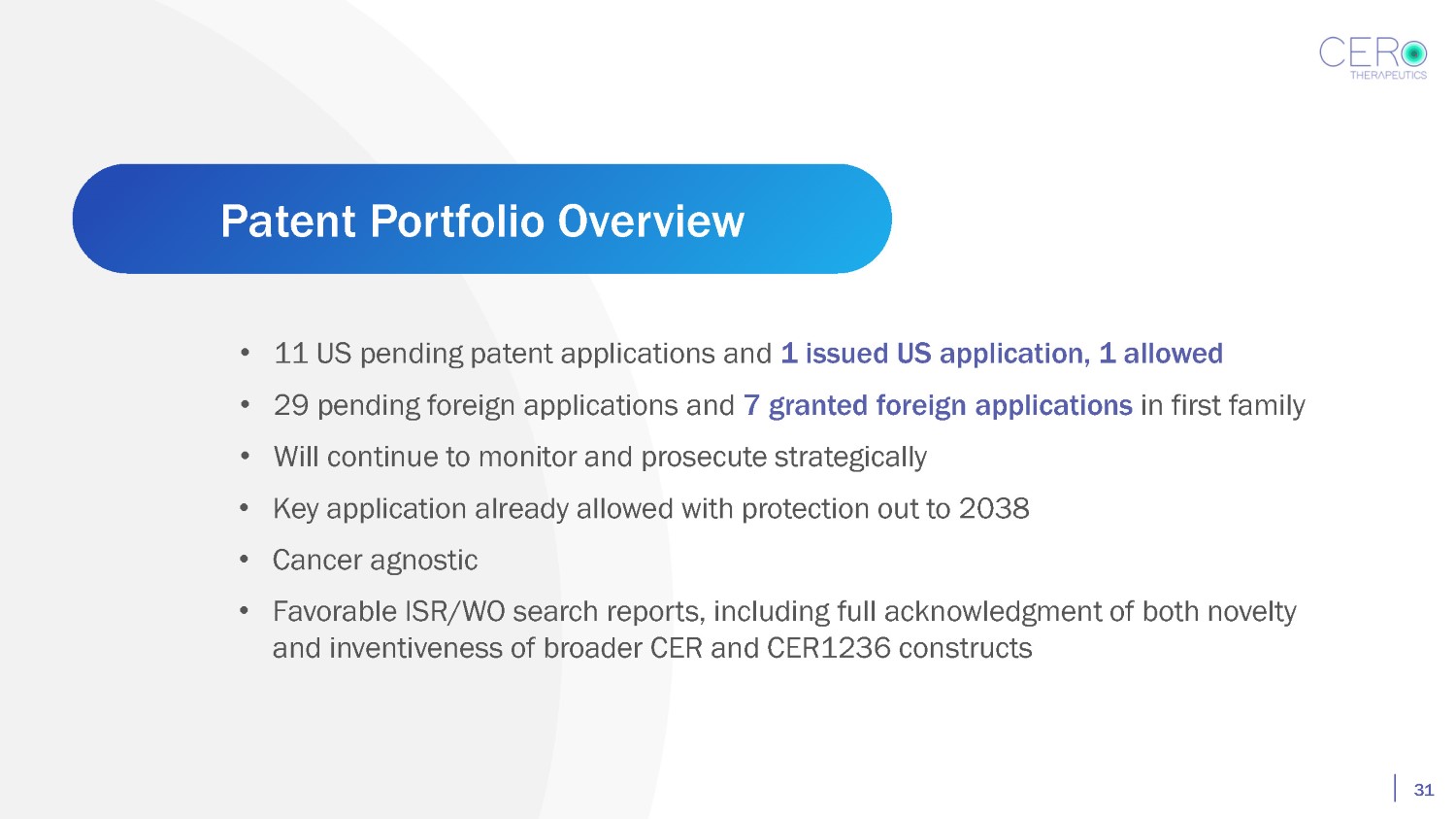 • 11 US pending patent applications and 1 issued US application, 1 allowed • 29 pending foreign applications and 7 granted foreign applications in first family • Will continue to monitor and prosecute strategically • Key application already allowed with protection out to 2038 • Cancer agnostic • Favorable ISR/WO search reports, including full acknowledgment of both novelty and inventiveness of broader CER and CER1236 constructs Patent Portfolio Overview 31