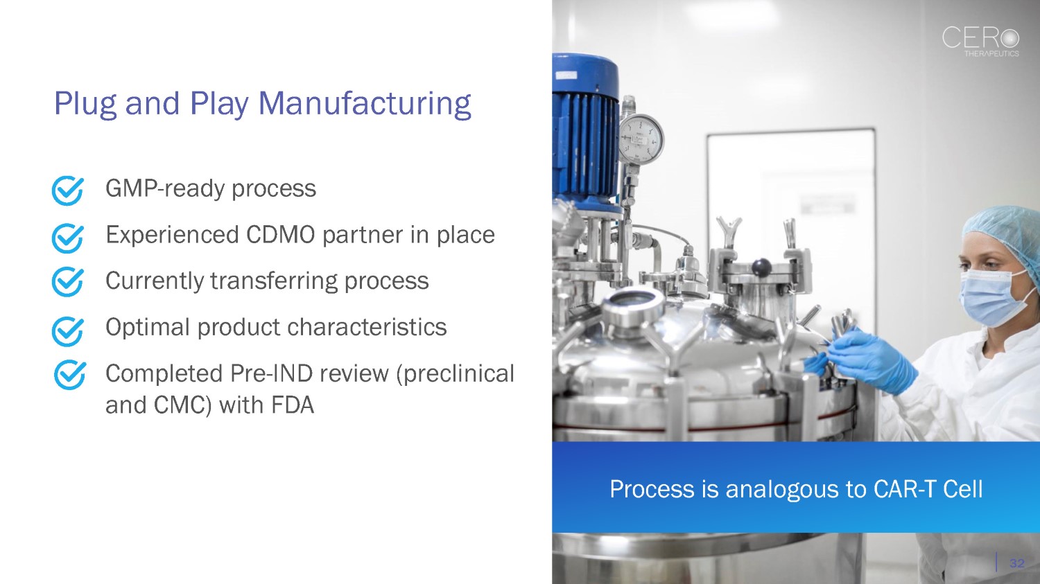 Plug and Play Manufacturing GMP - ready process Experienced CDMO partner in place Currently transferring process Optimal product characteristics Completed Pre - IND review (preclinical and CMC) with FDA Process is analogous to CAR - T Cell 32