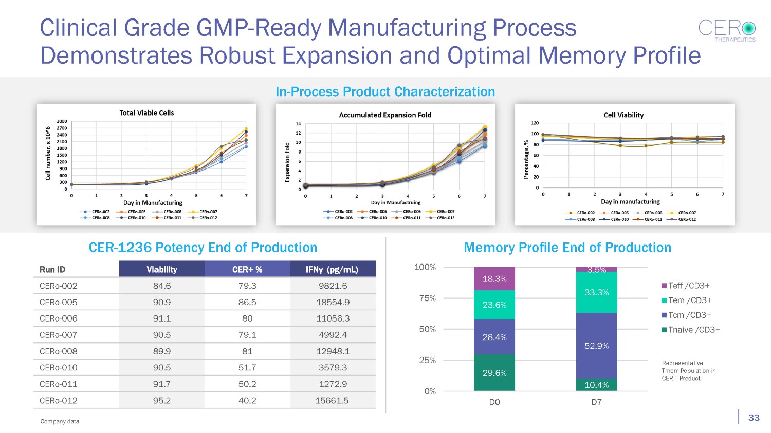 29.6% 10.4% 28.4% 52.9% 23.6% 33.3% 18.3% 3.5% 0% 25% 50% 75% 100% D0 D7 Teff /CD3+ Tem /CD3+ Tcm /CD3+ Tnaive /CD3+ 33 Run ID Viability CER+ % IFNγ (pg/mL) CERo - 002 84.6 79.3 9821.6 CERo - 005 90.9 86.5 18554.9 CERo - 006 91.1 80 11056.3 CERo - 007 90.5 79.1 4992.4 CERo - 008 89.9 81 12948.1 CERo - 010 90.5 51.7 3579.3 CERo - 011 91.7 50.2 1272.9 CERo - 012 95.2 40.2 15661.5 Representative Tmem Population in CER T Product Clinical Grade GMP - Ready Manufacturing Process Demonstrates Robust Expansion and Optimal Memory Profile In - Process Product Characterization CER - 1236 Potency End of Production Memory Profile End of Production Company data
