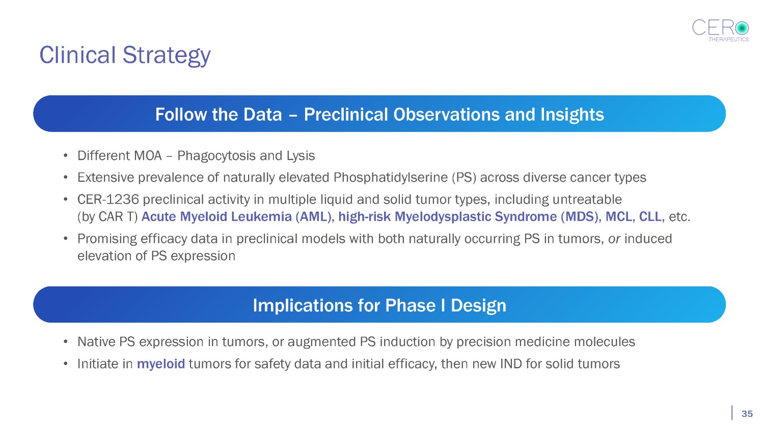 Positioned for Phase I Success Deep preclinical data set, novel mechanism of action, clinical history with CAR - T Adaptive Phase I design: explore patient response in step - wise protocol, maximize opportunity to elicit clinical signal while evaluating safety Determine dose, conditioning therapy required to trigger CER T cell proliferation 34