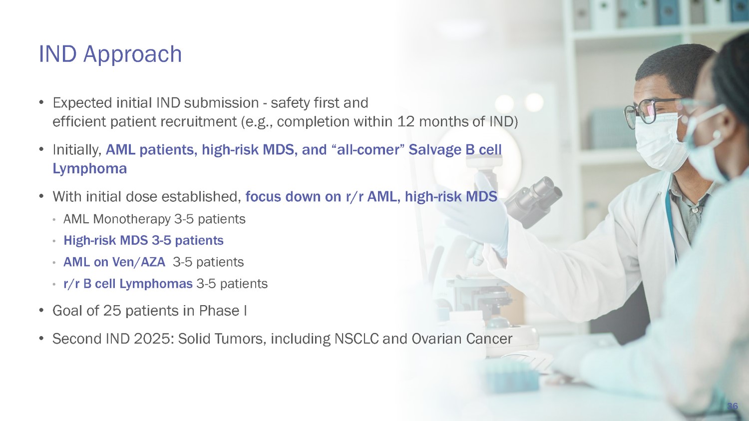 • Expected initial IND submission - safety first and efficient patient recruitment (e.g., completion within 12 months of IND) • Initially, AML patients, high - risk MDS, and “all - comer” Salvage B cell Lymphoma • With initial dose established, focus down on r/r AML, high - risk MDS • AML Monotherapy 3 - 5 patients • High - risk MDS 3 - 5 patients • AML on Ven/AZA 3 - 5 patients • r/r B cell Lymphomas 3 - 5 patients • Goal of 25 patients in Phase I • Second IND 2025: Solid Tumors, including NSCLC and Ovarian Cancer 36 IND Approach
