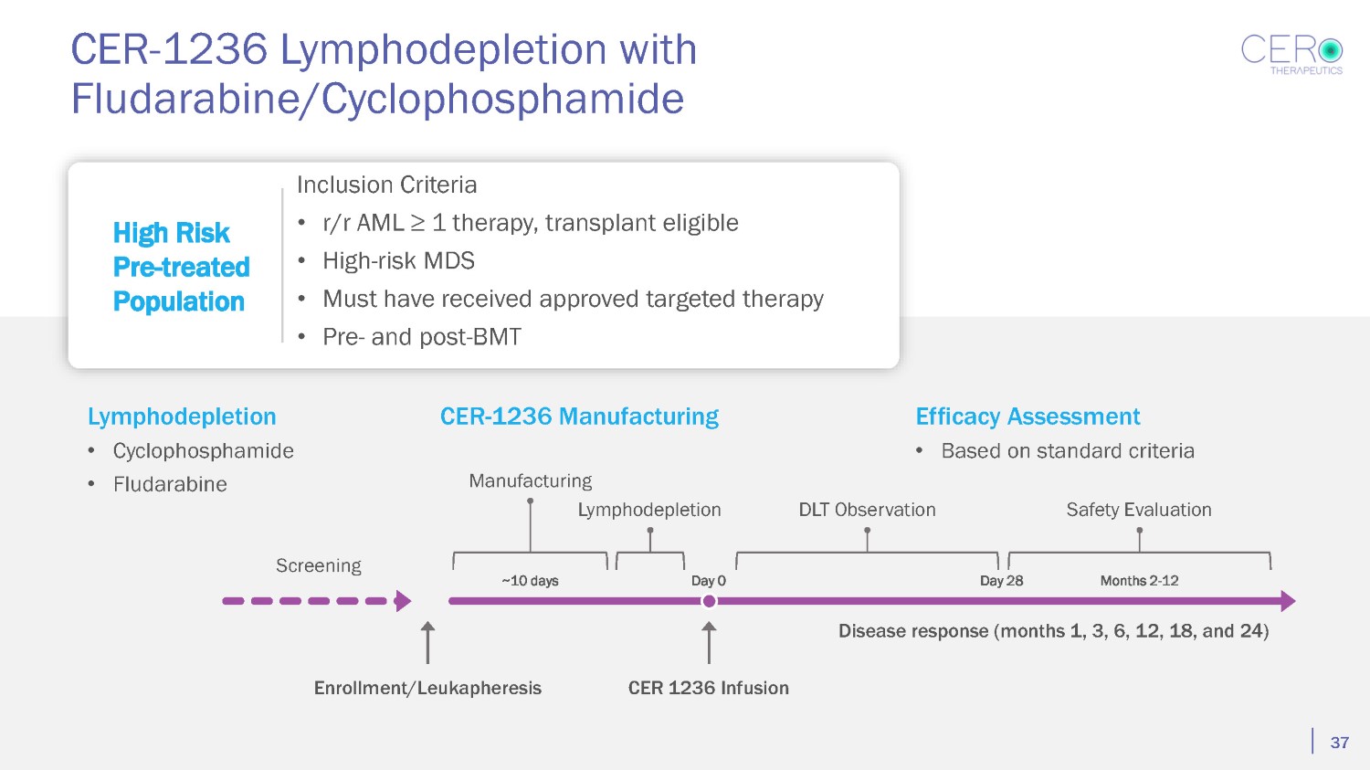 CER - 1236 Lymphodepletion with Fludarabine/Cyclophosphamide Lymphodepletion • Cyclophosphamide • Fludarabine CER - 1236 Manufacturing Screening Enrollment/Leukapheresis CER 1236 Infusion Efficacy Assessment • Based on standard criteria DLT Observation Safety Evaluation Day 28 Months 2 - 12 Disease response (months 1, 3, 6, 12, 18, and 24) ~10 days Manufacturing Lymphodepletion Day 0 High Risk Pre - treated Population Inclusion Criteria • r/r AML ≥ 1 therapy, transplant eligible • High - risk MDS • Must have received approved targeted therapy • Pre - and post - BMT 37