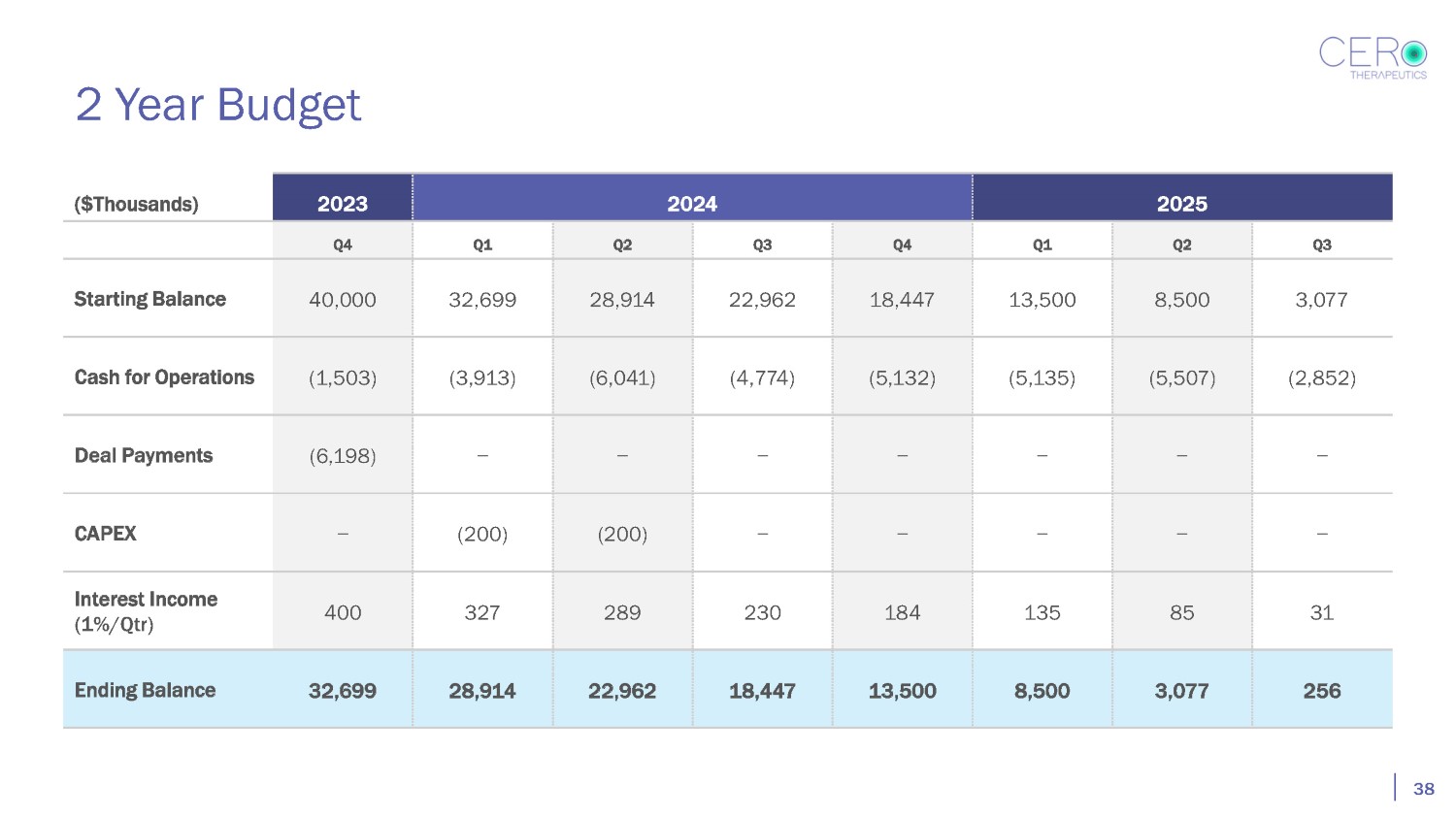 2 Year Budget 38 ($Thousands) 2023 2024 2025 Q4 Q1 Q2 Q3 Q4 Q1 Q2 Q3 Starting Balance 40,000 32,699 28,914 22,962 18,447 13,500 8,500 3,077 Cash for Operations (1,503) (3,913) (6,041) (4,774) (5,132) (5,135) (5,507) (2,852) Deal Payments (6,198) − − − − − − − CAPEX − (200) (200) − − − − − Interest Income (1%/Qtr) 400 327 289 230 184 135 85 31 Ending Balance 32,699 28,914 22,962 18,447 13,500 8,500 3,077 256
