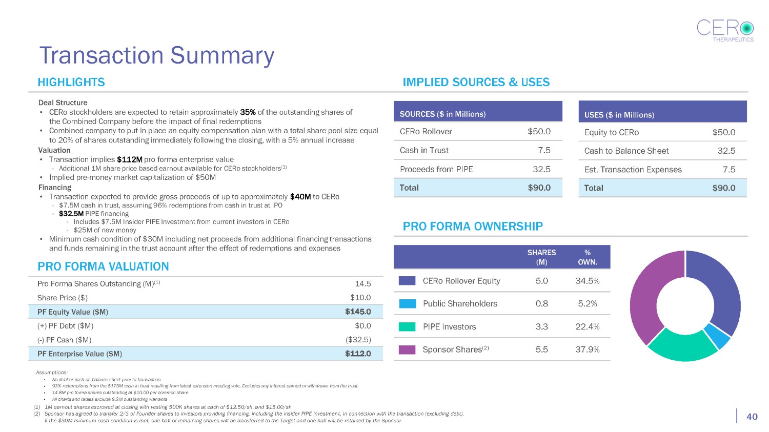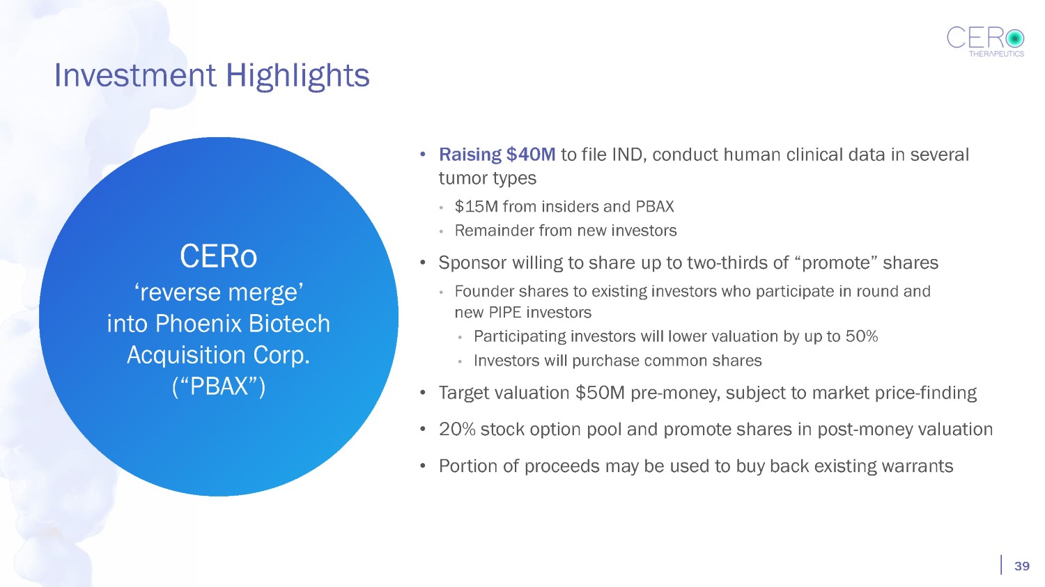 Investment Highlights CERo ‘reverse merge’ into Phoenix Biotech Acquisition Corp. (“PBAX”) 39 • Raising $40M to file IND, conduct human clinical data in several tumor types • $15M from insiders and PBAX • Remainder from new investors • Sponsor willing to share up to two - thirds of “promote” shares • Founder shares to existing investors who participate in round and new PIPE investors • Participating investors will lower valuation by up to 50% • Investors will purchase common shares • Target valuation $50M pre - money, subject to market price - finding • 20% stock option pool and promote shares in post - money valuation • Portion of proceeds may be used to buy back existing warrants
