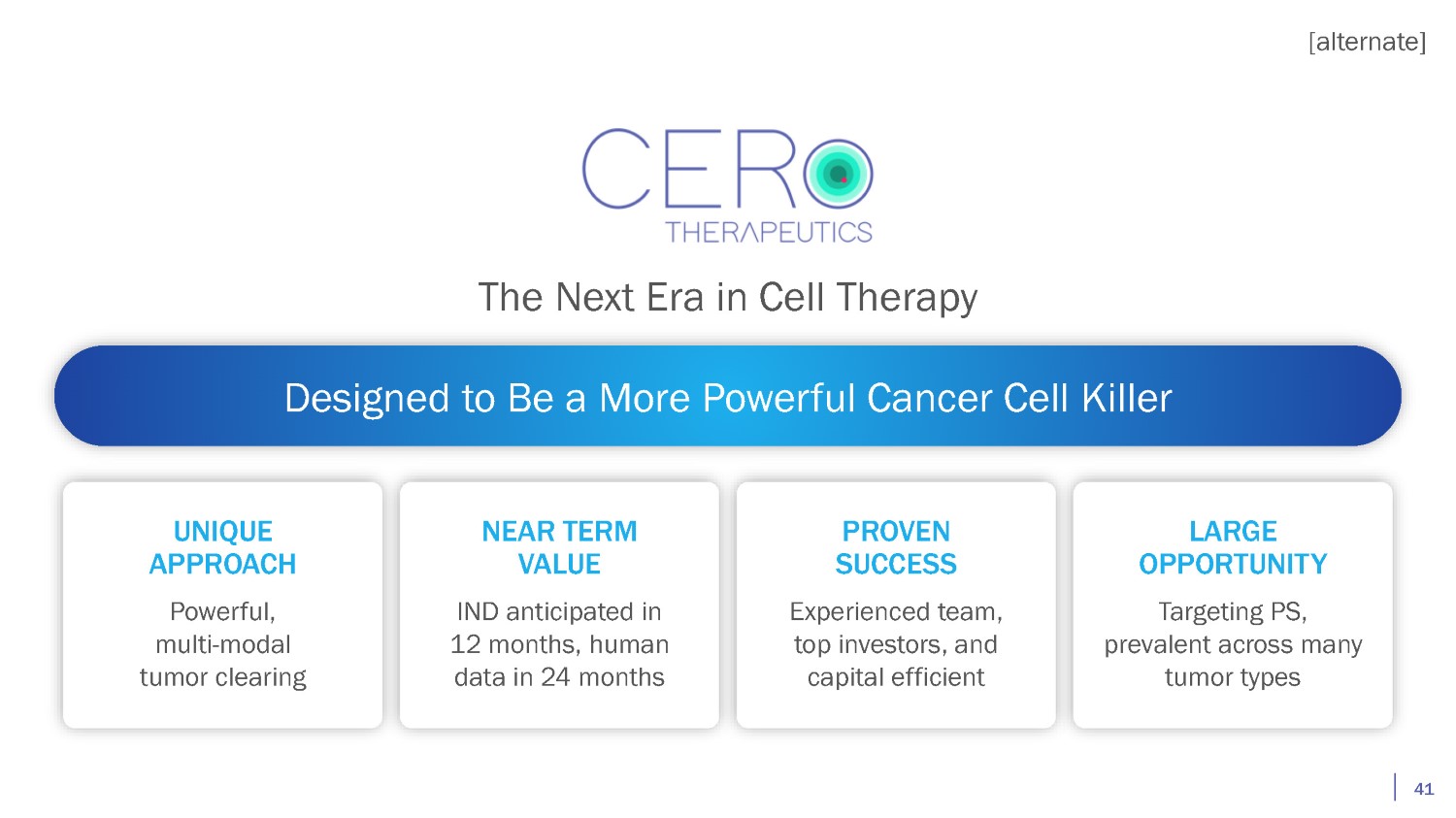 The Next Era in Cell Therapy Designed to Be a More Powerful Cancer Cell Killer UNIQUE APPROACH Powerful, multi - modal tumor clearing NEAR TERM VALUE IND anticipated in 12 months, human data in 24 months PROVEN SUCCESS Experienced team, top investors, and capital efficient LARGE OPPORTUNITY Targeting PS, prevalent across many tumor types [alternate] 41