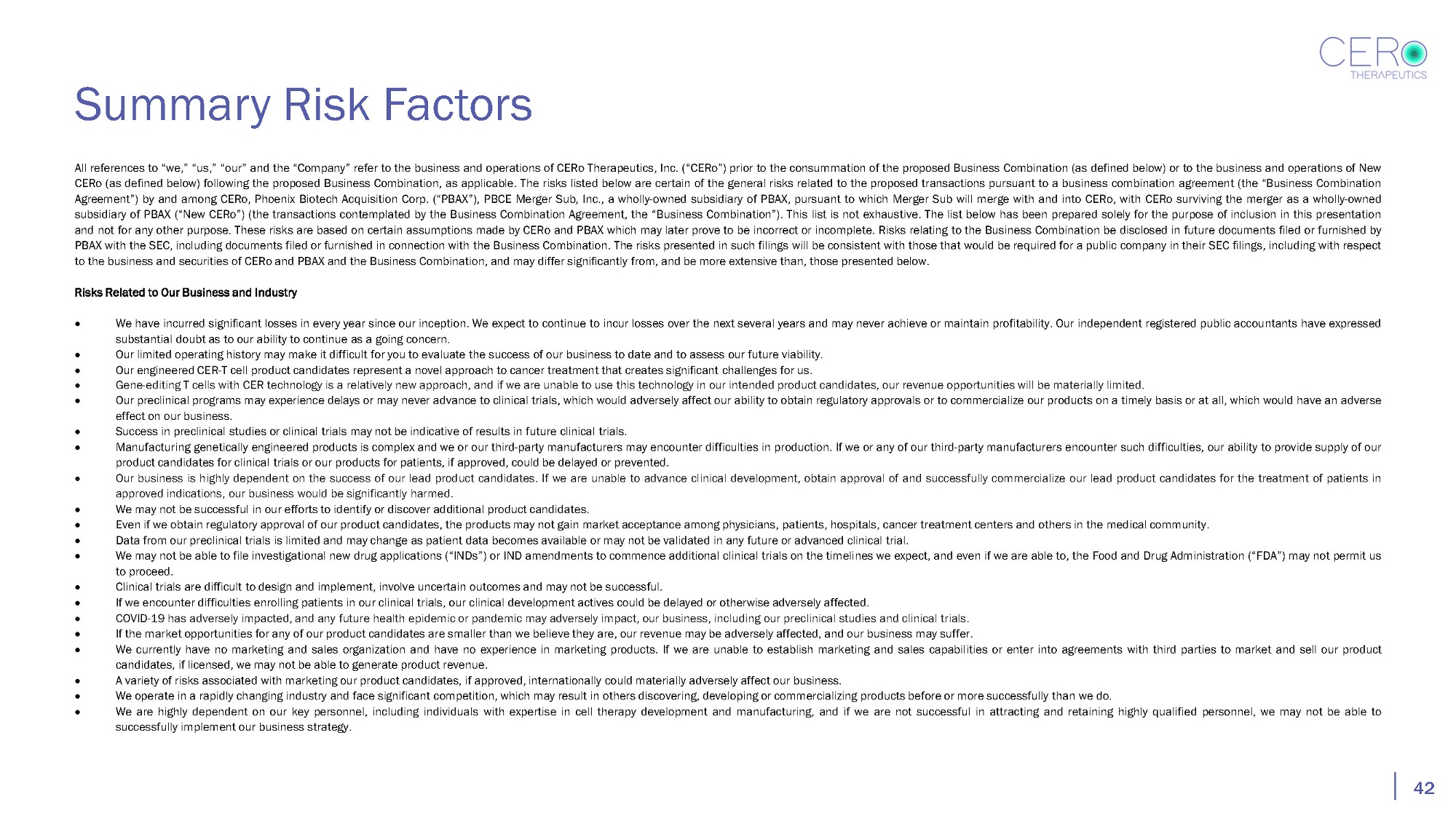 Summary Risk Factors 42 All references to “we,” “us,” “our” and the “Company” refer to the business and operations of CERo Therapeutics, Inc . (“CERo”) prior to the consummation of the proposed Business Combination (as defined below) or to the business and operations of New CERo (as defined below) following the proposed Business Combination, as applicable . The risks listed below are certain of the general risks related to the proposed transactions pursuant to a business combination agreement (the “Business Combination Agreement”) by and among CERo, Phoenix Biotech Acquisition Corp . (“PBAX”), PBCE Merger Sub, Inc . , a wholly - owned subsidiary of PBAX, pursuant to which Merger Sub will merge with and into CERo, with CERo surviving the merger as a wholly - owned subsidiary of PBAX (“New CERo”) (the transactions contemplated by the Business Combination Agreement, the “Business Combination”) . This list is not exhaustive . The list below has been prepared solely for the purpose of inclusion in this presentation and not for any other purpose . These risks are based on certain assumptions made by CERo and PBAX which may later prove to be incorrect or incomplete . Risks relating to the Business Combination be disclosed in future documents filed or furnished by PBAX with the SEC, including documents filed or furnished in connection with the Business Combination . The risks presented in such filings will be consistent with those that would be required for a public company in their SEC filings, including with respect to the business and securities of CERo and PBAX and the Business Combination, and may differ significantly from, and be more extensive than, those presented below . Risks Related to Our Business and Industry We have incurred significant losses in every year since our inception. We expect to continue to incur losses over the next several years and may never achieve or maintain profitability. Our independent registered public accountants have expressed substantial doubt as to our ability to continue as a going concern. Our limited operating history may make it difficult for you to evaluate the success of our business to date and to assess our future viability. Our engineered CER - T cell product candidates represent a novel approach to cancer treatment that creates significant challenges for us. Gene - editing T cells with CER technology is a relatively new approach, and if we are unable to use this technology in our intended product candidates, our revenue opportunities will be materially limited. Our preclinical programs may experience delays or may never advance to clinical trials, which would adversely affect our ability to obtain regulatory approvals or to commercialize our products on a timely basis or at all, which would have an adverse effect on our business. Success in preclinical studies or clinical trials may not be indicative of results in future clinical trials. Manufacturing genetically engineered products is complex and we or our third - party manufacturers may encounter difficulties in production. If we or any of our third - party manufacturers encounter such difficulties, our ability to provide supply of our product candidates for clinical trials or our products for patients, if approved, could be delayed or prevented. Our business is highly dependent on the success of our lead product candidates. If we are unable to advance clinical development, obtain approval of and successfully commercialize our lead product candidates for the treatment of patients in approved indications, our business would be significantly harmed. We may not be successful in our efforts to identify or discover additional product candidates. Even if we obtain regulatory approval of our product candidates, the products may not gain market acceptance among physicians, patients, hospitals, cancer treatment centers and others in the medical community. Data from our preclinical trials is limited and may change as patient data becomes available or may not be validated in any future or advanced clinical trial. We may not be able to file investigational new drug applications (“INDs”) or IND amendments to commence additional clinical trials on the timelines we expect, and even if we are able to, the Food and Drug Administration (“FDA”) may not permit us to proceed. Clinical trials are difficult to design and implement, involve uncertain outcomes and may not be successful. If we encounter difficulties enrolling patients in our clinical trials, our clinical development actives could be delayed or otherwise adversely affected. COVID - 19 has adversely impacted, and any future health epidemic or pandemic may adversely impact, our business, including our preclinical studies and clinical trials. If the market opportunities for any of our product candidates are smaller than we believe they are, our revenue may be adversely affected, and our business may suffer. We currently have no marketing and sales organization and have no experience in marketing products. If we are unable to establish marketing and sales capabilities or enter into agreements with third parties to market and sell our product candidates, if licensed, we may not be able to generate product revenue. A variety of risks associated with marketing our product candidates, if approved, internationally could materially adversely affect our business. We operate in a rapidly changing industry and face significant competition, which may result in others discovering, developing or commercializing products before or more successfully than we do. We are highly dependent on our key personnel, including individuals with expertise in cell therapy development and manufacturing, and if we are not successful in attracting and retaining highly qualified personnel, we may not be able to successfully implement our business strategy.
