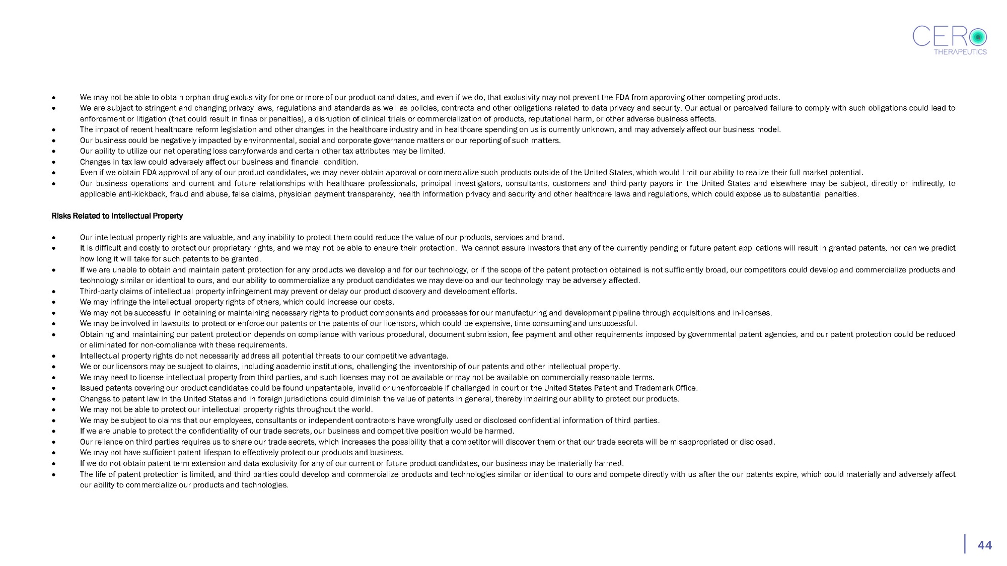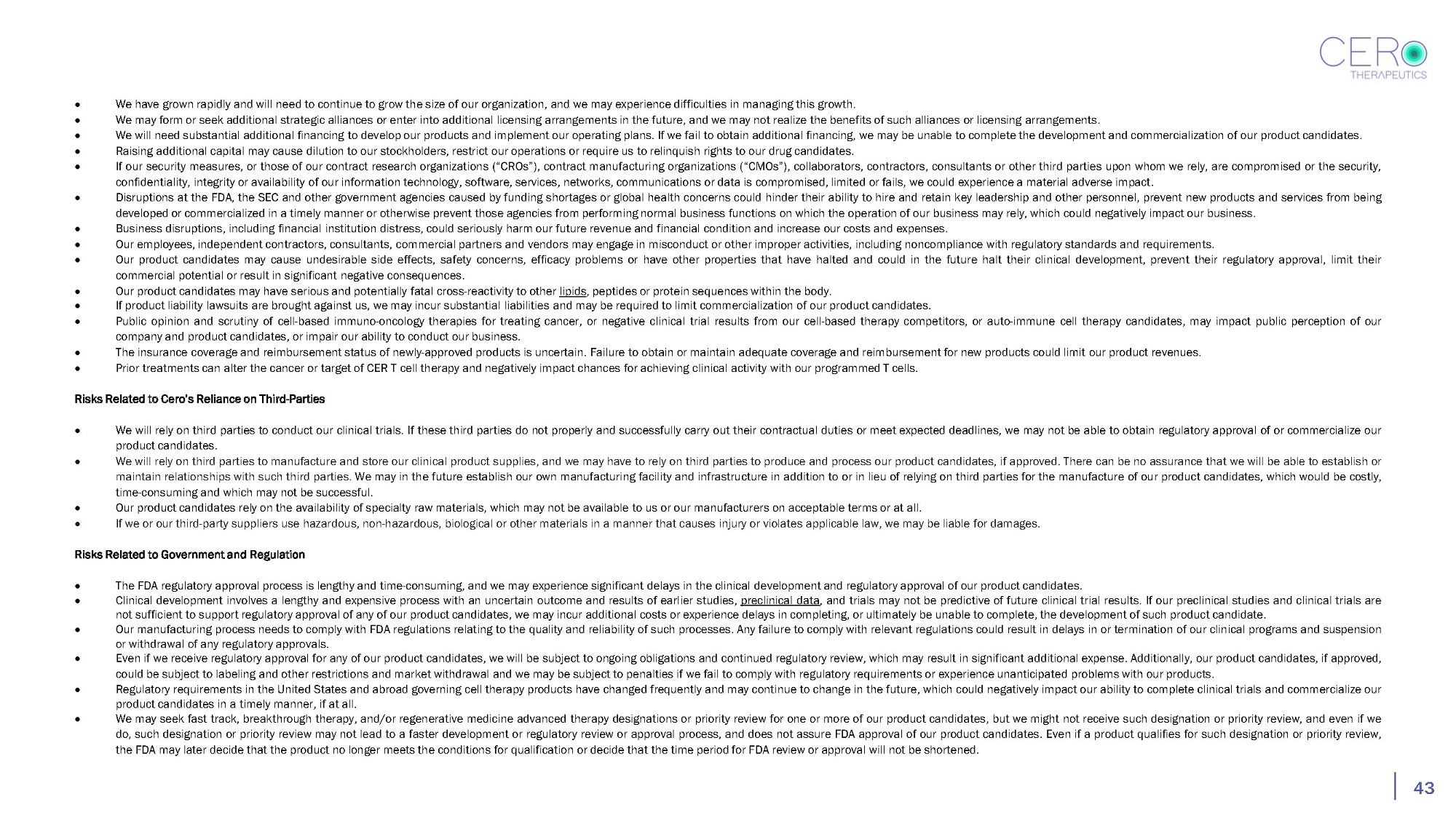 43 We have grown rapidly and will need to continue to grow the size of our organization, and we may experience difficulties in managing this growth. We may form or seek additional strategic alliances or enter into additional licensing arrangements in the future, and we may not realize the benefits of such alliances or licensing arrangements. We will need substantial additional financing to develop our products and implement our operating plans. If we fail to obtain additional financing, we may be unable to complete the development and commercialization of our product candidates. Raising additional capital may cause dilution to our stockholders, restrict our operations or require us to relinquish rights to our drug candidates. If our security measures, or those of our contract research organizations (“CROs”), contract manufacturing organizations (“CMOs”), collaborators, contractors, consultants or other third parties upon whom we rely, are compromised or the security, confidentiality, integrity or availability of our information technology, software, services, networks, communications or data is compromised, limited or fails, we could experience a material adverse impact. Disruptions at the FDA, the SEC and other government agencies caused by funding shortages or global health concerns could hinder their ability to hire and retain key leadership and other personnel, prevent new products and services from being developed or commercialized in a timely manner or otherwise prevent those agencies from performing normal business functions on which the operation of our business may rely, which could negatively impact our business. Business disruptions, including financial institution distress, could seriously harm our future revenue and financial condition and increase our costs and expenses. Our employees, independent contractors, consultants, commercial partners and vendors may engage in misconduct or other improper activities, including noncompliance with regulatory standards and requirements. Our product candidates may cause undesirable side effects, safety concerns, efficacy problems or have other properties that have halted and could in the future halt their clinical development, prevent their regulatory approval, limit their commercial potential or result in significant negative consequences. Our product candidates may have serious and potentially fatal cross - reactivity to other lipids, peptides or protein sequences within the body. If product liability lawsuits are brought against us, we may incur substantial liabilities and may be required to limit commercialization of our product candidates. Public opinion and scrutiny of cell - based immuno - oncology therapies for treating cancer, or negative clinical trial results from our cell - based therapy competitors, or auto - immune cell therapy candidates, may impact public perception of our company and product candidates, or impair our ability to conduct our business. The insurance coverage and reimbursement status of newly - approved products is uncertain. Failure to obtain or maintain adequate coverage and reimbursement for new products could limit our product revenues. Prior treatments can alter the cancer or target of CER T cell therapy and negatively impact chances for achieving clinical activity with our programmed T cells. Risks Related to Cero’s Reliance on Third - Parties We will rely on third parties to conduct our clinical trials . If these third parties do not properly and successfully carry out their contractual duties or meet expected deadlines, we may not be able to obtain regulatory approval of or commercialize our product candidates . We will rely on third parties to manufacture and store our clinical product supplies, and we may have to rely on third parties to produce and process our product candidates, if approved . There can be no assurance that we will be able to establish or maintain relationships with such third parties . We may in the future establish our own manufacturing facility and infrastructure in addition to or in lieu of relying on third parties for the manufacture of our product candidates, which would be costly, time - consuming and which may not be successful . Our product candidates rely on the availability of specialty raw materials, which may not be available to us or our manufacturers on acceptable terms or at all . If we or our third - party suppliers use hazardous, non - hazardous, biological or other materials in a manner that causes injury or violates applicable law, we may be liable for damages . Risks Related to Government and Regulation The FDA regulatory approval process is lengthy and time - consuming, and we may experience significant delays in the clinical development and regulatory approval of our product candidates. Clinical development involves a lengthy and expensive process with an uncertain outcome and results of earlier studies, preclinical data , and trials may not be predictive of future clinical trial results. If our preclinical studies and clinical trials are not sufficient to support regulatory approval of any of our product candidates, we may incur additional costs or experience delays in completing, or ultimately be unable to complete, the development of such product candidate. Our manufacturing process needs to comply with FDA regulations relating to the quality and reliability of such processes. Any failure to comply with relevant regulations could result in delays in or termination of our clinical programs and suspension or withdrawal of any regulatory approvals. Even if we receive regulatory approval for any of our product candidates, we will be subject to ongoing obligations and continued regulatory review, which may result in significant additional expense. Additionally, our product candidates, if approved, could be subject to labeling and other restrictions and market withdrawal and we may be subject to penalties if we fail to comply with regulatory requirem