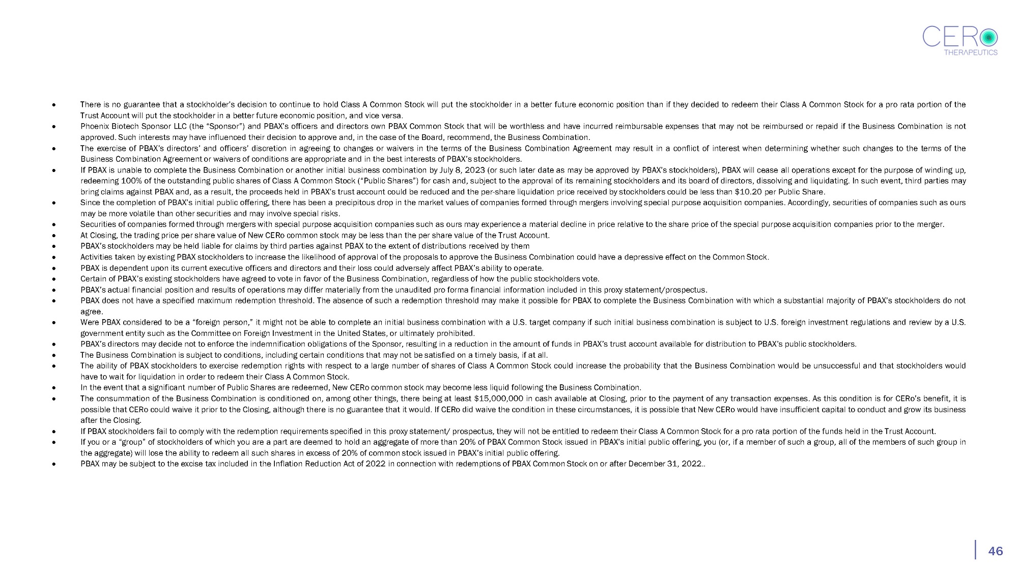 46 There is no guarantee that a stockholder’s decision to continue to hold Class A Common Stock will put the stockholder in a better future economic position than if they decided to redeem their Class A Common Stock for a pro rata portion of the Trust Account will put the stockholder in a better future economic position, and vice versa . Phoenix Biotech Sponsor LLC (the “Sponsor”) and PBAX’s officers and directors own PBAX Common Stock that will be worthless and have incurred reimbursable expenses that may not be reimbursed or repaid if the Business Combination is not approved . Such interests may have influenced their decision to approve and, in the case of the Board, recommend, the Business Combination . The exercise of PBAX’s directors’ and officers’ discretion in agreeing to changes or waivers in the terms of the Business Combination Agreement may result in a conflict of interest when determining whether such changes to the terms of the Business Combination Agreement or waivers of conditions are appropriate and in the best interests of PBAX’s stockholders . If PBAX is unable to complete the Business Combination or another initial business combination by July 8 , 2023 (or such later date as may be approved by PBAX’s stockholders), PBAX will cease all operations except for the purpose of winding up, redeeming 100 % of the outstanding public shares of Class A Common Stock (“Public Shares”) for cash and, subject to the approval of its remaining stockholders and its board of directors, dissolving and liquidating . In such event, third parties may bring claims against PBAX and, as a result, the proceeds held in PBAX’s trust account could be reduced and the per - share liquidation price received by stockholders could be less than $ 10 . 20 per Public Share . Since the completion of PBAX’s initial public offering, there has been a precipitous drop in the market values of companies formed through mergers involving special purpose acquisition companies. Accordingly, securities of companies such as ours may be more volatile than other securities and may involve special risks. Securities of companies formed through mergers with special purpose acquisition companies such as ours may experience a material decline in price relative to the share price of the special purpose acquisition companies prior to the merger. At Closing, the trading price per share value of New CERo common stock may be less than the per share value of the Trust Account. PBAX’s stockholders may be held liable for claims by third parties against PBAX to the extent of distributions received by them Activities taken by existing PBAX stockholders to increase the likelihood of approval of the proposals to approve the Business Combination could have a depressive effect on the Common Stock. PBAX is dependent upon its current executive officers and directors and their loss could adversely affect PBAX’s ability to operate. Certain of PBAX’s existing stockholders have agreed to vote in favor of the Business Combination, regardless of how the public stockholders vote. PBAX’s actual financial position and results of operations may differ materially from the unaudited pro forma financial information included in this proxy statement/prospectus. PBAX does not have a specified maximum redemption threshold. The absence of such a redemption threshold may make it possible for PBAX to complete the Business Combination with which a substantial majority of PBAX’s stockholders do not agree. Were PBAX considered to be a “foreign person,” it might not be able to complete an initial business combination with a U.S. target company if such initial business combination is subject to U.S. foreign investment regulations and review by a U.S. government entity such as the Committee on Foreign Investment in the United States, or ultimately prohibited. PBAX’s directors may decide not to enforce the indemnification obligations of the Sponsor, resulting in a reduction in the amount of funds in PBAX’s trust account available for distribution to PBAX’s public stockholders. The Business Combination is subject to conditions, including certain conditions that may not be satisfied on a timely basis, if at all. The ability of PBAX stockholders to exercise redemption rights with respect to a large number of shares of Class A Common Stock could increase the probability that the Business Combination would be unsuccessful and that stockholders would have to wait for liquidation in order to redeem their Class A Common Stock. In the event that a significant number of Public Shares are redeemed, New CERo common stock may become less liquid following the Business Combination. The consummation of the Business Combination is conditioned on, among other things, there being at least $ 15 , 000 , 000 in cash available at Closing, prior to the payment of any transaction expenses . As this condition is for CERo’s benefit, it is possible that CERo could waive it prior to the Closing, although there is no guarantee that it would . If CERo did waive the condition in these circumstances, it is possible that New CERo would have insufficient capital to conduct and grow its business after the Closing . If PBAX stockholders fail to comply with the redemption requirements specified in this proxy statement/ prospectus, they will not be entitled to redeem their Class A Common Stock for a pro rata portion of the funds held in the Trust Account. If you or a “group” of stockholders of which you are a part are deemed to hold an aggregate of more than 20% of PBAX Common Stock issued in PBAX’s initial public offering, you (or, if a member of such a group, all of the members of such group in the aggregate) will lose the ability to redeem all such shares in excess of 20% of common stock issued in PBAX’s initial public offering. PBAX may be subject to the excise tax included in the Inflation Reduction Act of 2022 in connection with redemptions of PB