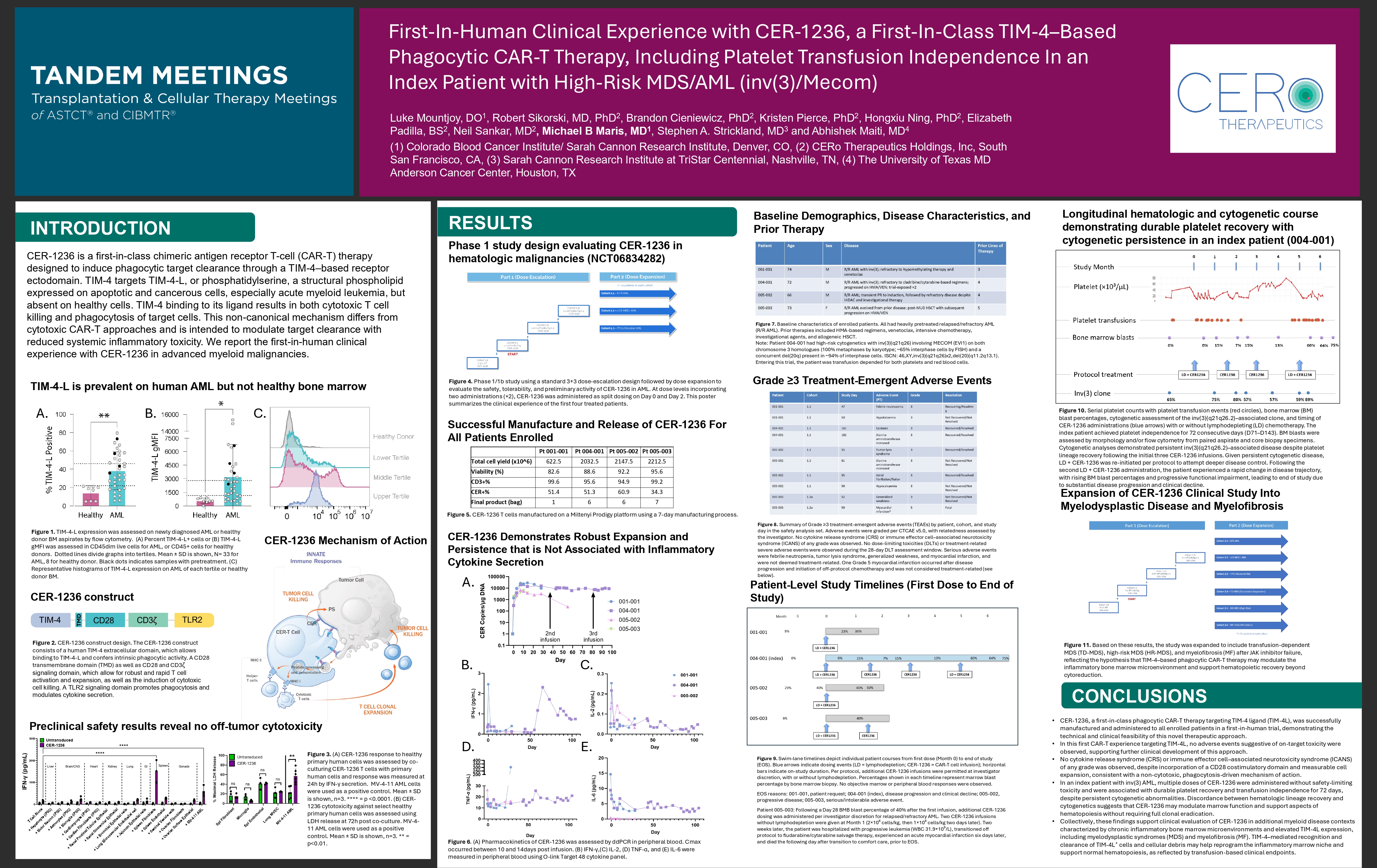 CER - 1236 is a first - in - class chimeric antigen receptor T - cell (CAR - T) therapy designed to induce phagocytic target clearance through a TIM - 4 – based receptor ectodomain. TIM - 4 targets TIM - 4 - L, or phosphatidylserine, a structural phospholipid expressed on apoptotic and cancerous cells, especially acute myeloid leukemia, but absent on healthy cells. TIM - 4 binding to its ligand results in both cytotoxic T cell killing and phagocytosis of target cells. This non - canonical mechanism differs from cytotoxic CAR - T approaches and is intended to modulate target clearance with reduced systemic inflammatory toxicity. We report the first - in - human clinical experience with CER - 1236 in advanced myeloid malignancies. INTRODUCTION ϙϙϙϙϙϙϙϙ First - In - Human Clinical Experience with CER - 1236, a First - In - Class TIM - 4 – Based Phagocytic CAR - T Therapy, Including Platelet Transfusion Independence In an Index Patient with High - Risk MDS/AML (inv(3)/Mecom) 5(68/76 Preclinical safety results reveal no off - tumor cytotoxicity Figure 3. (A) CER - 1236 response to healthy primary human cells was assessed by co - culturing CER - 1236 T cells with primary human cells and response was measured at 24h by IFN - γ secretion. MV - 4 - 11 AML cells were used as a positive control. Mean ± SD is shown, n=3. **** = p <0.0001. (B) CER - 1236 cytotoxicity against select healthy primary human cells was assessed using LDH release at 72h post co - culture. MV - 4 - 11 AML cells were used as a positive control. Mean ± SD is shown, n=3. ** = p<0.01. 7,0    /LVSUHYDOHQWRQKXPDQ$0/EXWQRWKHDOWK\ERQHPDUURZ Figure 1. TIM - 4 - L expression was assessed on newly diagnosed AML or healthy donor BM aspirates by flow cytometry. (A) Percent TIM - 4 - L+ cells or (B) TIM - 4 - L gMFI was assessed in CD45dim live cells for AML, or CD45+ cells for healthy donors. Dotted lines divide graphs into tertiles. Mean ± SD is shown, N= 33 for AML, 8 for healthy donor. Black dots indicates samples with pretreatment. (C) Representative histograms of TIM - 4 - L expression on AML of each tertile or healthy donor BM. A. ϟ C. &(5   FRQVWUXFW Figure 2. CER - 1236 construct design. The CER - 1236 construct consists of a human TIM - 4 extracellular domain, which allows binding to TIM - 4 - L and confers intrinsic phagocytic activity. A CD28 transmembrane domain (TMD) as well as CD28 and CD3 ζ signaling domain, which allow for robust and rapid T cell activation and expansion, as well as the induction of cytotoxic cell killing. A TLR2 signaling domain promotes phagocytosis and modulates cytokine secretion. TMD &(5   0HFKDQLVPRI$FWLRQ CONCLUSIONS • CER - 1236, a first - in - class phagocytic CAR - T therapy targeting TIM - 4 ligand (TIM - 4L), was successfully manufactured and administered to all enrolled patients in a first - in - human trial, demonstrating the technical and clinical feasibility of this novel therapeutic approach. • In this first CAR - T experience targeting TIM - 4L, no adverse events suggestive of on - target toxicity were observed, supporting further clinical development of this approach. • No cytokine release syndrome (CRS) or immune effector cell – associated neurotoxicity syndrome (ICANS) of any grade was observed, despite incorporation of a CD28 costimulatory domain and measurable cell expansion, consistent with a non - cytotoxic, phagocytosis - driven mechanism of action. • In an index patient with inv(3) AML, multiple doses of CER - 1236 were administered without safety - limiting toxicity and were associated with durable platelet recovery and transfusion independence for 72 days, despite persistent cytogenetic abnormalities. Discordance between hematologic lineage recovery and cytogenetics suggests that CER - 1236 may modulate marrow function and support aspects of hematopoiesis without requiring full clonal eradication. • Collectively, these findings support clinical evaluation of CER - 1236 in additional myeloid disease contexts characterized by chronic inflammatory bone marrow microenvironments and elevated TIM - 4L expression, including myelodysplastic syndromes (MDS) and myelofibrosis (MF). TIM - 4 – mediated recognition and clearance of TIM - 4L ⁺ cells and cellular debris may help reprogram the inflammatory marrow niche and support normal hematopoiesis, as reflected by transfusion - based clinical endpoints. >ĖČŪŘôϙ ͖ ϟ ϙ ÍŜôīĖIJôϙèēÍŘÍèťôŘĖŜťĖèŜϙĺċϙôIJŘĺīīôîϙŕÍťĖôIJťŜϟϙīīϙēÍîϙēôÍŽĖīƅϙŕŘôťŘôÍťôîϙŘôīÍŕŜôîϯŘôċŘÍèťĺŘƅϙa[ϙ ϼ‡ϯ‡ϙa[Ͻϟϙ„ŘĖĺŘϙťēôŘÍŕĖôŜϙĖIJèīŪîôîϙFa ϱ æÍŜôîϙŘôČĖıôIJŜϠϙŽôIJôťĺèīÍƄϠϙĖIJťôIJŜĖŽôϙèēôıĺťēôŘÍŕƅϠϙ ĖIJŽôŜťĖČÍťĖĺIJÍīϙÍČôIJťŜϠϙÍIJîϙÍīīĺČôIJôĖèϙF‹“ϟ bĺťôϡϙ„ÍťĖôIJťϙ ͏͏͓ ϱ ͏͏͐ϙ ēÍîϙēĖČē ϱ ŘĖŜħϙèƅťĺČôIJôťĖèŜϙſĖťēϙĖIJŽϼ ͒ Ͻϼŗ ͑͐ ŗ ͕͑ ϽϙĖIJŽĺīŽĖIJČϙa(iaϙϼ(«I ͐ ϽϙĺIJϙæĺťēϙ èēŘĺıĺŜĺıôϙ ͒ϙ ēĺıĺīĺČŪôŜϙϼ ͐͏͏ ҇ϙıôťÍŕēÍŜôŜϙæƅϙħÍŘƅĺťƅŕôϢϙѹ ͕͔ ҇ϙĖIJťôŘŕēÍŜôϙèôīīŜϙæƅϙ>I‹FϽϙÍIJîϙÍϙ èĺIJèŪŘŘôIJťϙîôīϼ ͑͏ ŗϽϙŕŘôŜôIJťϙĖIJϙѹ ͓͘ ҇ϙĺċϙĖIJťôŘŕēÍŜôϙèôīīŜϟϙI‹bϡϙ ͓͕ Ϡ³´ϠĖIJŽϼ ͒ Ͻϼŗ ͑͐ ŗ ͕͑ ϽƄ ͑ Ϡîôīϼ ͑͏ Ͻϼŗ ͐͐ϟ͑ ŗ ͐͒ϟ͐ Ͻϟϙ (IJťôŘĖIJČϙťēĖŜϙťŘĖÍīϠϙťēôϙŕÍťĖôIJťϙſÍŜϙťŘÍIJŜċŪŜĖĺIJϙîôŕôIJîôîϙċĺŘϙæĺťēϙŕīÍťôīôťŜϙÍIJîϙŘôîϙæīĺĺîϙèôīīŜϟ Figure 8. Summary of Grade ≥3 treatment - emergent adverse events (TEAEs) by patient, cohort, and study day in the safety analysis set. Adverse events were graded per CTCAE v5.0, with relatedness assessed by the investigator. No cytokine release syndrome (CRS) or immune effec
