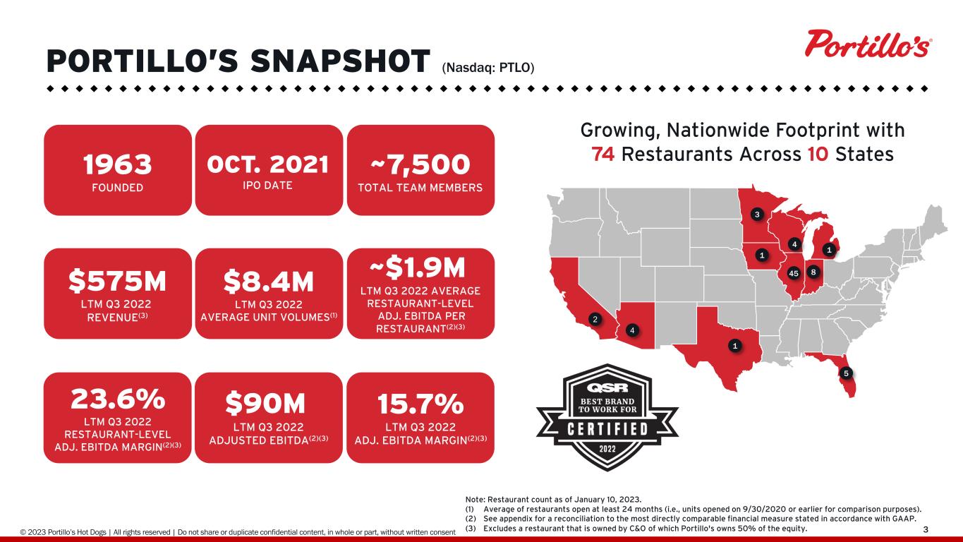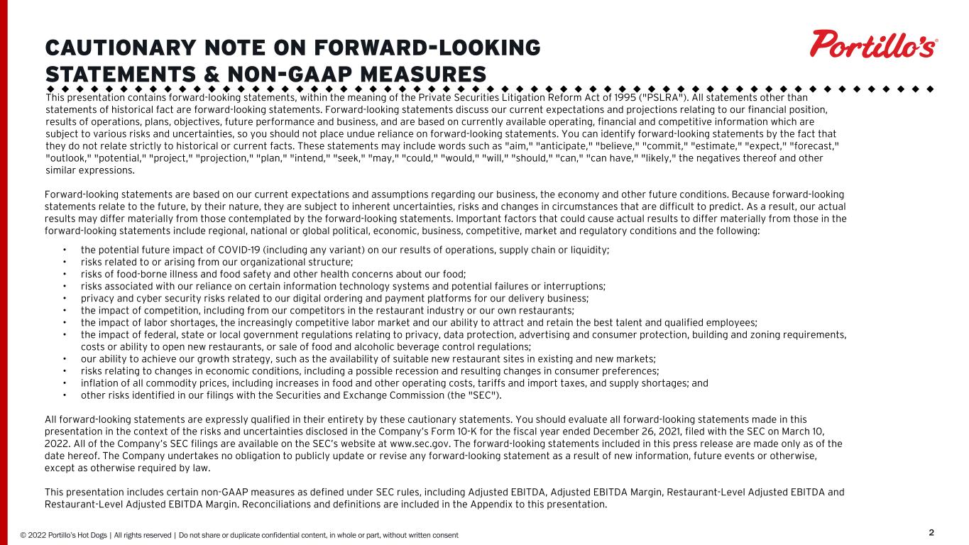 © 2019 Portillo’s Hot Dogs | All rights reserved | Do not share or duplicate confidential content, in whole or part, without written consent 222 This presentation contains forward-looking statements, within the meaning of the Private Securities Litigation Reform Act of 1995 ("PSLRA"). All statements other than statements of historical fact are forward-looking statements. Forward-looking statements discuss our current expectations and projections relating to our financial position, results of operations, plans, objectives, future performance and business, and are based on currently available operating, financial and competitive information which are subject to various risks and uncertainties, so you should not place undue reliance on forward-looking statements. You can identify forward-looking statements by the fact that they do not relate strictly to historical or current facts. These statements may include words such as "aim," "anticipate," "believe," "commit," "estimate," "expect," "forecast," "outlook," "potential," "project," "projection," "plan," "intend," "seek," "may," "could," "would," "will," "should," "can," "can have," "likely," the negatives thereof and other similar expressions. Forward-looking statements are based on our current expectations and assumptions regarding our business, the economy and other future conditions. Because forward-looking statements relate to the future, by their nature, they are subject to inherent uncertainties, risks and changes in circumstances that are difficult to predict. As a result, our actual results may differ materially from those contemplated by the forward-looking statements. Important factors that could cause actual results to differ materially from those in the forward-looking statements include regional, national or global political, economic, business, competitive, market and regulatory conditions and the following: • the potential future impact of COVID-19 (including any variant) on our results of operations, supply chain or liquidity; • risks related to or arising from our organizational structure; • risks of food-borne illness and food safety and other health concerns about our food; • risks associated with our reliance on certain information technology systems and potential failures or interruptions; • privacy and cyber security risks related to our digital ordering and payment platforms for our delivery business; • the impact of competition, including from our competitors in the restaurant industry or our own restaurants; • the impact of labor shortages, the increasingly competitive labor market and our ability to attract and retain the best talent and qualified employees; • the impact of federal, state or local government regulations relating to privacy, data protection, advertising and consumer protection, building and zoning requirements, costs or ability to open new restaurants, or sale of food and alcoholic beverage control regulations; • our ability to achieve our growth strategy, such as the availability of suitable new restaurant sites in existing and new markets; • risks relating to changes in economic conditions, including a possible recession and resulting changes in consumer preferences; • inflation of all commodity prices, including increases in food and other operating costs, tariffs and import taxes, and supply shortages; and • other risks identified in our filings with the Securities and Exchange Commission (the "SEC"). All forward-looking statements are expressly qualified in their entirety by these cautionary statements. You should evaluate all forward-looking statements made in this presentation in the context of the risks and uncertainties disclosed in the Company’s Form 10-K for the fiscal year ended December 26, 2021, filed with the SEC on March 10, 2022. All of the Company’s SEC filings are available on the SEC’s website at www.sec.gov. The forward-looking statements included in this press release are made only as of the date hereof. The Company undertakes no obligation to publicly update or revise any forward-looking statement as a result of new information, future events or otherwise, except as otherwise required by law. This presentation includes certain non-GAAP measures as defined under SEC rules, including Adjusted EBITDA, Adjusted EBITDA Margin, Restaurant-Level Adjusted EBITDA and Restaurant-Level Adjusted EBITDA Margin. Reconciliations and definitions are included in the Appendix to this presentation. CAUTIONARY NOTE ON FORWARD-LOOKING STATEMENTS & NON-GAAP MEASURES