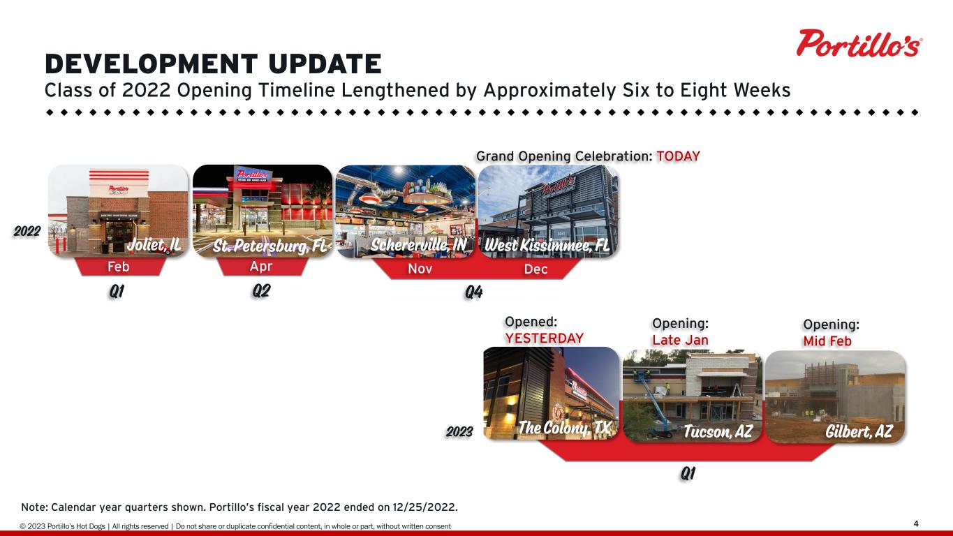 © 2019 Portillo’s Hot Dogs | All rights reserved | Do not share or duplicate confidential content, in whole or part, without written consent 423 DEVELOPMENT UPDATE Class of 2022 Opening Timeline Lengthened by Approximately Six to Eight Weeks Schererville, IN The Colony, TX West Kissimmee, FL 2022 2023 Tucson, AZ Gilbert, AZ Nov Grand Opening Celebration: TODAY Opened: YESTERDAY Opening: Late Jan Opening: Mid Feb Feb Q1 Q2 Joliet, IL Apr Q4 Dec Q1 St. Petersburg, FL Note: Calendar year quarters shown. Portillo’s fiscal year 2022 ended on 12/25/2022.