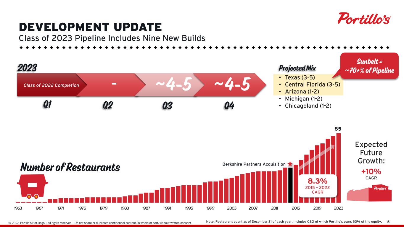 © 2019 Portillo’s Hot Dogs | All rights reserved | Do not share or duplicate confidential content, in whole or part, without written consent 523 Note: Restaurant count as of December 31 of each year. Includes C&O of which Portillo's owns 50% of the equity. 85 1963 1967 1971 1975 1979 1983 1987 1991 1995 1999 2003 2007 2011 2015 2019 2023 Number of Restaurants Berkshire Partners Acquisition 8.3% 2015 – 2022 CAGR Expected Future Growth: +10% CAGR DEVELOPMENT UPDATE Class of 2023 Pipeline Includes Nine New Builds • Texas (3-5) • Central Florida (3-5) • Arizona (1-2) • Michigan (1-2) • Chicagoland (1-2) Sunbelt = ~70+% of Pipeline Class of 2022 Completion - ~4-5 ~4-5 2023 Q1 Q2 Q3 Q4 Projected Mix