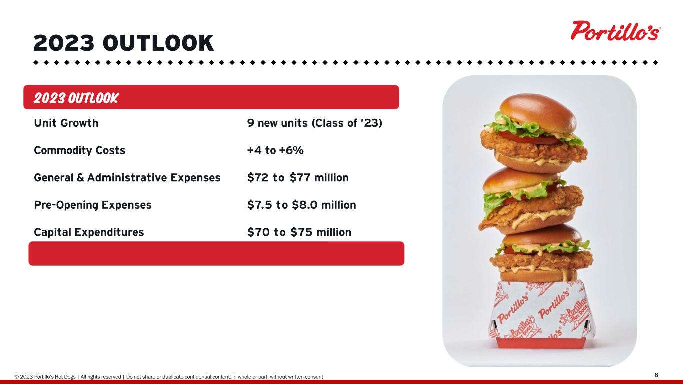 © 2019 Portillo’s Hot Dogs | All rights reserved | Do not share or duplicate confidential content, in whole or part, without written consent 623 2023 OUTLOOK 2 0 2 3 OUTLOOK Unit Growth 9 new units (Class of ’23) Commodity Costs +4 to +6% General & Administrative Expenses $72 to $77 million Pre-Opening Expenses $7.5 to $8.0 million Capital Expenditures $70 to $75 million