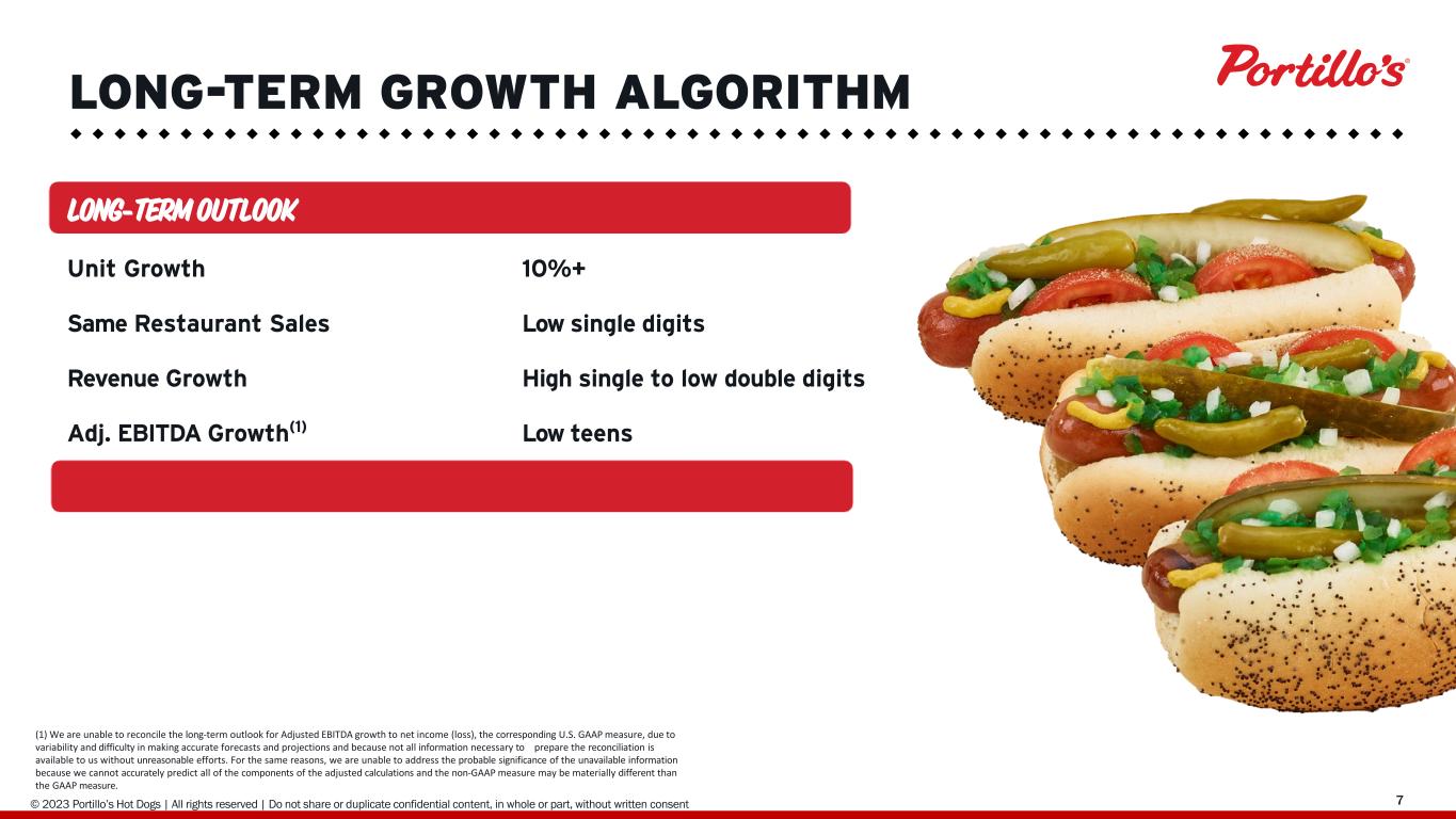© 2019 Portillo’s Hot Dogs | All rights reserved | Do not share or duplicate confidential content, in whole or part, without written consent 723 LONG-TERM GROWTH ALGORITHM LONG-TERM OUTLOOK Unit Growth 10%+ Same Restaurant Sales Low single digits Revenue Growth High single to low double digits Adj. EBITDA Growth(1) Low teens (1) We are unable to reconcile the long-term outlook for Adjusted EBITDA growth to net income (loss), the corresponding U.S. GAAP measure, due to variability and difficulty in making accurate forecasts and projections and because not all information necessary to prepare the reconciliation is available to us without unreasonable efforts. For the same reasons, we are unable to address the probable significance of the unavailable information because we cannot accurately predict all of the components of the adjusted calculations and the non-GAAP measure may be materially different than the GAAP measure.