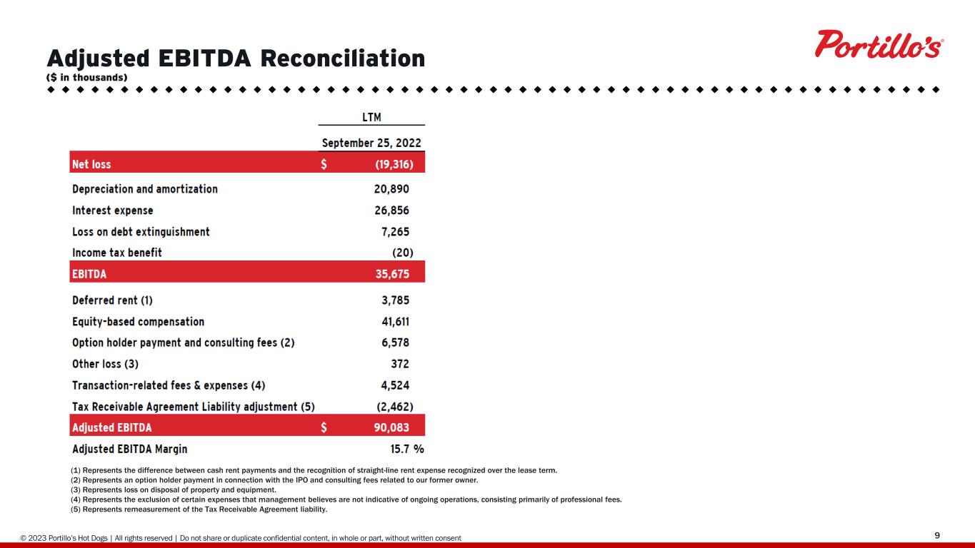 © 2019 Portillo’s Hot Dogs | All rights reserved | Do not share or duplicate confidential content, in whole or part, without written consent 923 Adjusted EBITDA Reconciliation ($ in thousands) (1) Represents the difference between cash rent payments and the recognition of straight-line rent expense recognized over the lease term. (2) Represents an option holder payment in connection with the IPO and consulting fees related to our former owner. (3) Represents loss on disposal of property and equipment. (4) Represents the exclusion of certain expenses that management believes are not indicative of ongoing operations, consisting primarily of professional fees. (5) Represents remeasurement of the Tax Receivable Agreement liability.
