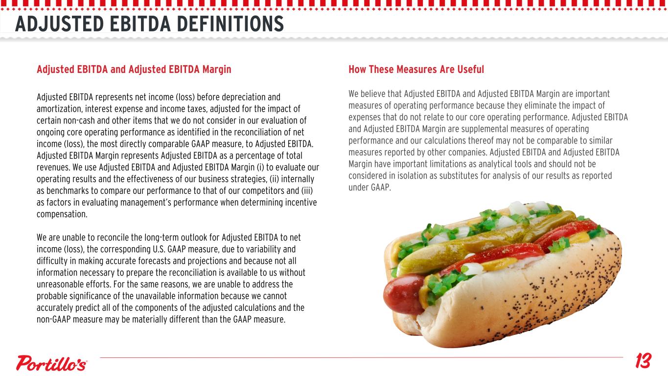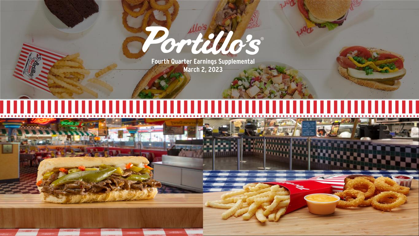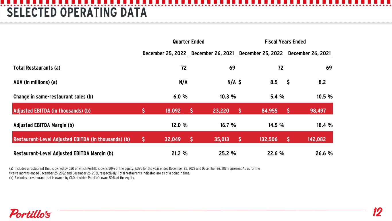 SELECTED OPERATING DATA (a) Includes a restaurant that is owned by C&O of which Portillo’s owns 50% of the equity. AUVs for the year ended December 25, 2022 and December 26, 2021 represent AUVs for the twelve months ended December 25, 2022 and December 26, 2021, respectively. Total restaurants indicated are as of a point in time. (b) Excludes a restaurant that is owned by C&O of which Portillo’s owns 50% of the equity. Quarter Ended Fiscal Years Ended December 25, 2022 December 26, 2021 December 25, 2022 December 26, 2021 Total Restaurants (a) 72 69 72 69 AUV (in millions) (a) N/A N/A $ 8.5 $ 8.2 Change in same-restaurant sales (b) 6.0 % 10.3 % 5.4 % 10.5 % Adjusted EBITDA (in thousands) (b) $ 18,092 $ 23,220 $ 84,955 $ 98,497 Adjusted EBITDA Margin (b) 12.0 % 16.7 % 14.5 % 18.4 % Restaurant-Level Adjusted EBITDA (in thousands) (b) $ 32,049 $ 35,013 $ 132,506 $ 142,082 Restaurant-Level Adjusted EBITDA Margin (b) 21.2 % 25.2 % 22.6 % 26.6 %