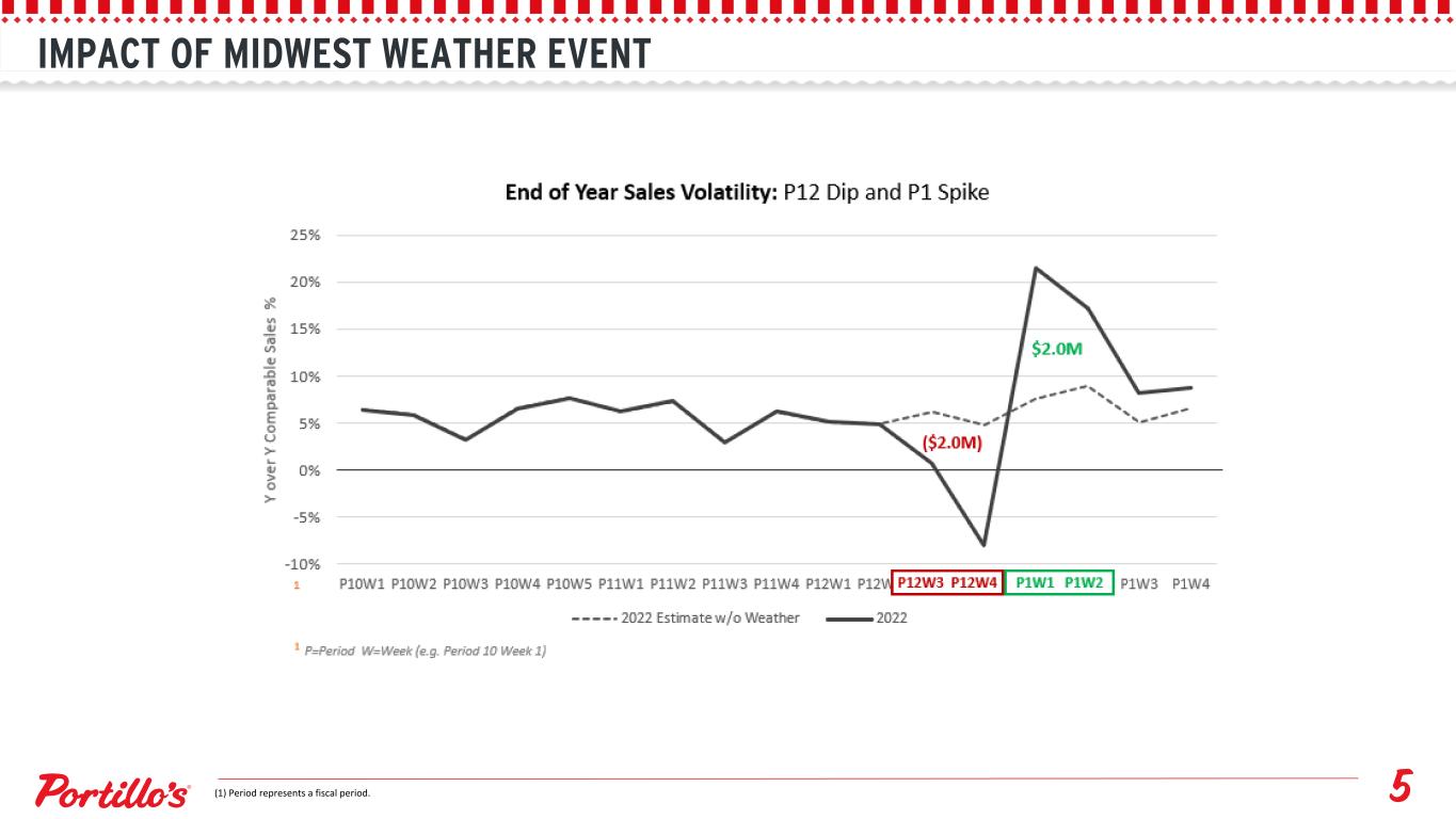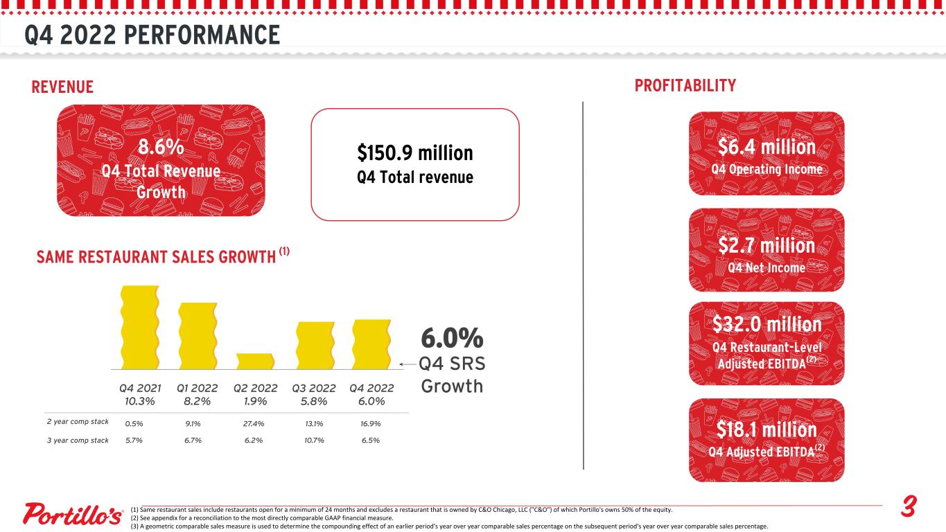 Q4 2022 PERFORMANCE REVENUE $150.9 million Q4 Total revenue SAME RESTAURANT SALES GROWTH (1) PROFITABILITY $6.4 million Q4 Operating Income 8.6% Q4 Total Revenue Growth (1) Same restaurant sales include restaurants open for a minimum of 24 months and excludes a restaurant that is owned by C&O Chicago, LLC ("C&O") of which Portillo's owns 50% of the equity. (2) See appendix for a reconciliation to the most directly comparable GAAP financial measure. (3) A geometric comparable sales measure is used to determine the compounding effect of an earlier period's year over year comparable sales percentage on the subsequent period's year over year comparable sales percentage. $18.1 million Q4 Adjusted EBITDA(2) $32.0 million Q4 Restaurant-Level Adjusted EBITDA(2) $2.7 million Q4 Net Income