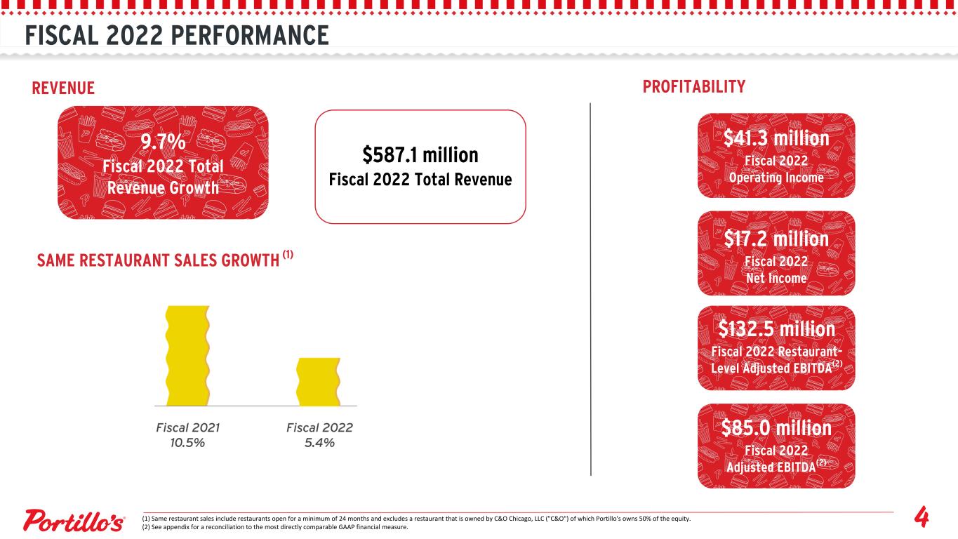 FISCAL 2022 PERFORMANCE REVENUE $587.1 million Fiscal 2022 Total Revenue SAME RESTAURANT SALES GROWTH (1) PROFITABILITY $41.3 million Fiscal 2022 Operating Income 9.7% Fiscal 2022 Total Revenue Growth (1) Same restaurant sales include restaurants open for a minimum of 24 months and excludes a restaurant that is owned by C&O Chicago, LLC ("C&O") of which Portillo's owns 50% of the equity. (2) See appendix for a reconciliation to the most directly comparable GAAP financial measure. $85.0 million Fiscal 2022 Adjusted EBITDA(2) $132.5 million Fiscal 2022 Restaurant- Level Adjusted EBITDA(2) $17.2 million Fiscal 2022 Net Income