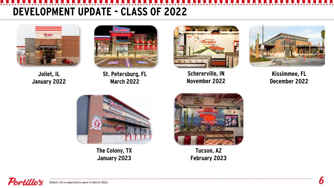 DEVELOPMENT UPDATE - CLASS OF 2022 Joliet, IL January 2022 St. Petersburg, FL March 2022 Schererville, IN November 2022 Kissimmee, FL December 2022 The Colony, TX January 2023 Tucson, AZ February 2023 Gilbert, AZ is expected to open in March 2023.
