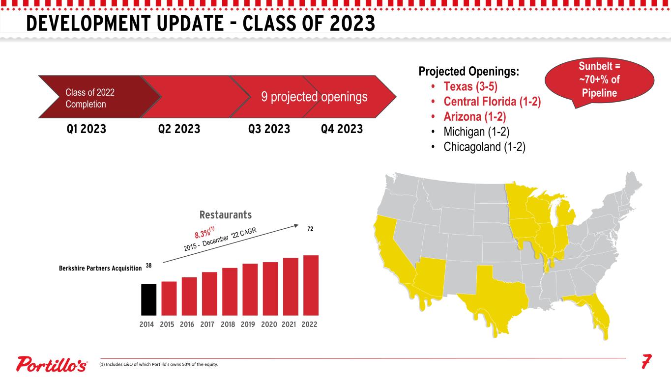 DEVELOPMENT UPDATE - CLASS OF 2023 Class of 2022 Completion 9 projected openings Projected Openings: • Texas (3-5) • Central Florida (1-2) • Arizona (1-2) • Michigan (1-2) • Chicagoland (1-2) Restaurants 2014 2015 2016 2017 2018 2019 2020 2021 2022 Berkshire Partners Acquisition 2015 - December '22 CAGR 72 8.3% (1) 38 (1) Includes C&O of which Portillo's owns 50% of the equity. Q1 2023 Q2 2023 Q3 2023 Q4 2023 Sunbelt = ~70+% of Pipeline