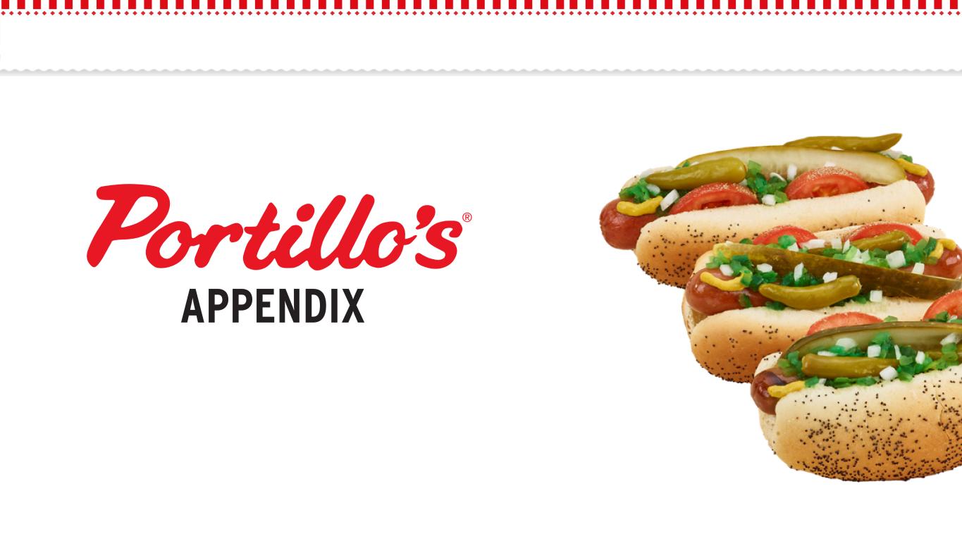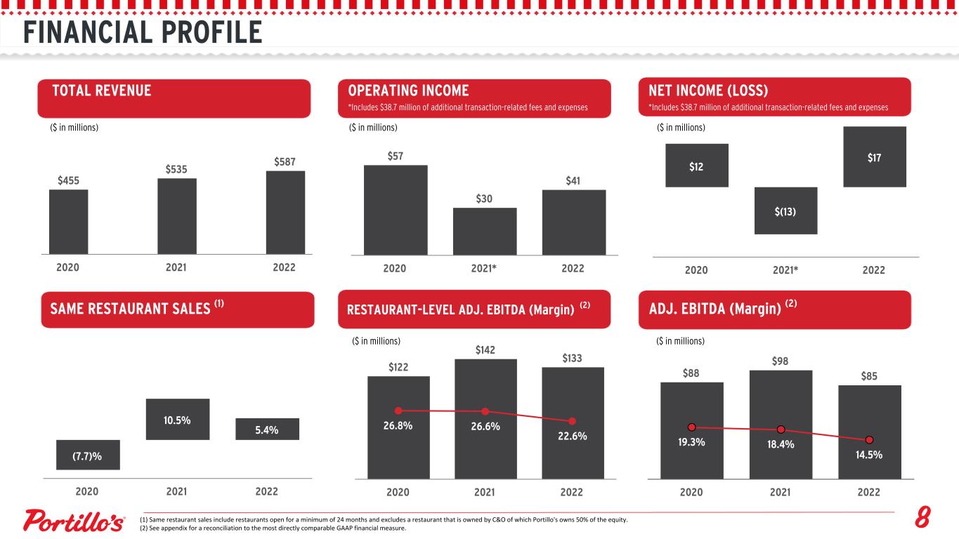 FINANCIAL PROFILE $57 $30 $41 2020 2021* 2022 $122 $142 $133 26.8% 26.6% 22.6% 2020 2021 2022 $12 $(13) $17 2020 2021* 2022 $88 $98 $85 19.3% 18.4% 14.5% 2020 2021 2022 (1) Same restaurant sales include restaurants open for a minimum of 24 months and excludes a restaurant that is owned by C&O of which Portillo's owns 50% of the equity. (2) See appendix for a reconciliation to the most directly comparable GAAP financial measure. $455 $535 $587 2020 2021 2022 (7.7)% 10.5% 5.4% 2020 2021 2022 TOTAL REVENUE OPERATING INCOME NET INCOME (LOSS) *Includes $38.7 million of additional transaction-related fees and expenses *Includes $38.7 million of additional transaction-related fees and expenses SAME RESTAURANT SALES (1) RESTAURANT-LEVEL ADJ. EBITDA (Margin) (2) ADJ. EBITDA (Margin) (2) ($ in millions) ($ in millions) ($ in millions) ($ in millions) ($ in millions)