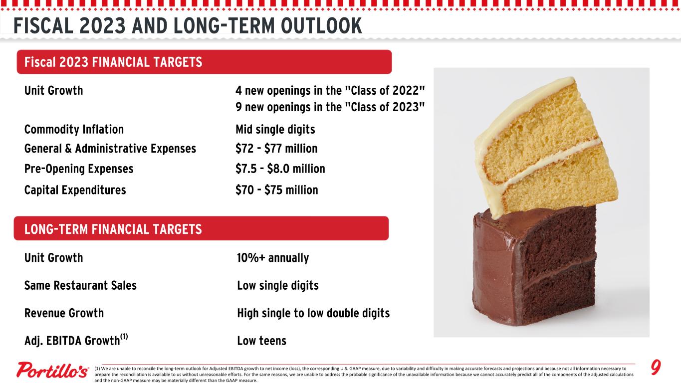 FISCAL 2023 AND LONG-TERM OUTLOOK (1) We are unable to reconcile the long-term outlook for Adjusted EBITDA growth to net income (loss), the corresponding U.S. GAAP measure, due to variability and difficulty in making accurate forecasts and projections and because not all information necessary to prepare the reconciliation is available to us without unreasonable efforts. For the same reasons, we are unable to address the probable significance of the unavailable information because we cannot accurately predict all of the components of the adjusted calculations and the non-GAAP measure may be materially different than the GAAP measure. Fiscal 2023 FINANCIAL TARGETS Unit Growth 4 new openings in the "Class of 2022" 9 new openings in the "Class of 2023" Commodity Inflation Mid single digits General & Administrative Expenses $72 - $77 million Pre-Opening Expenses $7.5 - $8.0 million Capital Expenditures $70 - $75 million LONG-TERM FINANCIAL TARGETS Unit Growth 10%+ annually Same Restaurant Sales Low single digits Revenue Growth High single to low double digits Adj. EBITDA Growth(1) Low teens