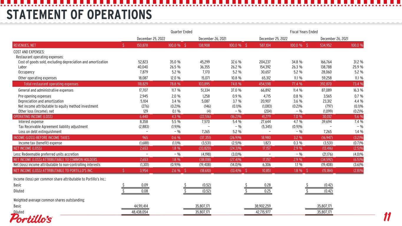 STATEMENT OF OPERATIONS Quarter Ended Fiscal Years Ended December 25, 2022 December 26, 2021 December 25, 2022 December 26, 2021 REVENUES, NET $ 150,878 100.0 % $ 138,908 100.0 % $ 587,104 100.0 % $ 534,952 100.0 % COST AND EXPENSES: Restaurant operating expenses: Cost of goods sold, excluding depreciation and amortization 52,823 35.0 % 45,299 32.6 % 204,237 34.8 % 166,764 31.2 % Labor 40,040 26.5 % 36,355 26.2 % 154,392 26.3 % 138,788 25.9 % Occupancy 7,879 5.2 % 7,170 5.2 % 30,657 5.2 % 28,060 5.2 % Other operating expenses 18,087 12.0 % 15,071 10.8 % 65,312 11.1 % 59,258 11.1 % Total restaurant operating expenses 118,829 78.8 % 103,895 74.8 % 454,598 77.4 % 392,870 73.4 % General and administrative expenses 17,707 11.7 % 51,334 37.0 % 66,892 11.4 % 87,089 16.3 % Pre-opening expenses 2,945 2.0 % 1,258 0.9 % 4,715 0.8 % 3,565 0.7 % Depreciation and amortization 5,104 3.4 % 5,087 3.7 % 20,907 3.6 % 23,312 4.4 % Net income attributable to equity method investment (276) (0.2) % (146) (0.1) % (1,083) (0.2) % (797) (0.1) % Other loss (income), net 129 0.1 % (4) — % (204) — % (1,099) (0.2) % OPERATING INCOME (LOSS) 6,440 4.3 % (22,516) (16.2) % 41,279 7.0 % 30,012 5.6 % Interest expense 8,358 5.5 % 7,570 5.4 % 27,644 4.7 % 39,694 7.4 % Tax Receivable Agreement liability adjustment (2,883) (1.9) % — — % (5,345) (0.9) % — — % Loss on debt extinguishment — — % 7,265 5.2 % — — % 7,265 1.4 % INCOME (LOSS) BEFORE INCOME TAXES 965 0.6 % (37,351) (26.9) % 18,980 3.2 % (16,947) (3.2) % Income tax (benefit) expense (1,688) (1.1) % (3,531) (2.5) % 1,823 0.3 % (3,531) (0.7) % NET INCOME (LOSS) 2,653 1.8 % (33,820) (24.3) % 17,157 2.9 % (13,416) (2.5) % Less: Redeemable preferred units accretion — — % (4,198) (3.0) % — — % (21,176) (4.0) % NET INCOME (LOSS) ATTRIBUTABLE TO COMMON HOLDERS 2,653 1.8 % (38,018) (27.4) % 17,157 2.9 % (34,592) (6.5) % Net (loss) income attributable to non-controlling interests (1,301) (0.9) % (19,408) (14.0) % 6,306 1.1 % (19,408) (3.6) % NET INCOME (LOSS) ATTRIBUTABLE TO PORTILLO'S INC. $ 3,954 2.6 % $ (18,610) (13.4) % $ 10,851 1.8 % $ (15,184) (2.8) % Income (loss) per common share attributable to Portillo’s Inc.: Basic $ 0.09 $ (0.52) $ 0.28 $ (0.42) Diluted $ 0.08 $ (0.52) $ 0.25 $ (0.42) Weighted-average common shares outstanding: Basic 44,911,414 35,807,171 38,902,259 35,807,171 Diluted 48,438,054 35,807,171 42,715,977 35,807,171