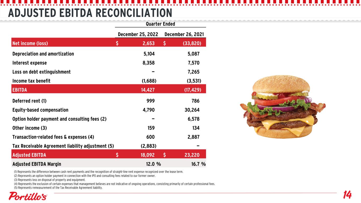 ADJUSTED EBITDA RECONCILIATION (1) Represents the difference between cash rent payments and the recognition of straight-line rent expense recognized over the lease term. (2) Represents an option holder payment in connection with the IPO and consulting fees related to our former owner. (3) Represents loss on disposal of property and equipment. (4) Represents the exclusion of certain expenses that management believes are not indicative of ongoing operations, consisting primarily of certain professional fees. (5) Represents remeasurement of the Tax Receivable Agreement liability. Quarter Ended December 25, 2022 December 26, 2021 Net income (loss) $ 2,653 $ (33,820) Depreciation and amortization 5,104 5,087 Interest expense 8,358 7,570 Loss on debt extinguishment — 7,265 Income tax benefit (1,688) (3,531) EBITDA 14,427 (17,429) Deferred rent (1) 999 786 Equity-based compensation 4,790 30,264 Option holder payment and consulting fees (2) — 6,578 Other income (3) 159 134 Transaction-related fees & expenses (4) 600 2,887 Tax Receivable Agreement liability adjustment (5) (2,883) — Adjusted EBITDA $ 18,092 $ 23,220 Adjusted EBITDA Margin 12.0 % 16.7 %