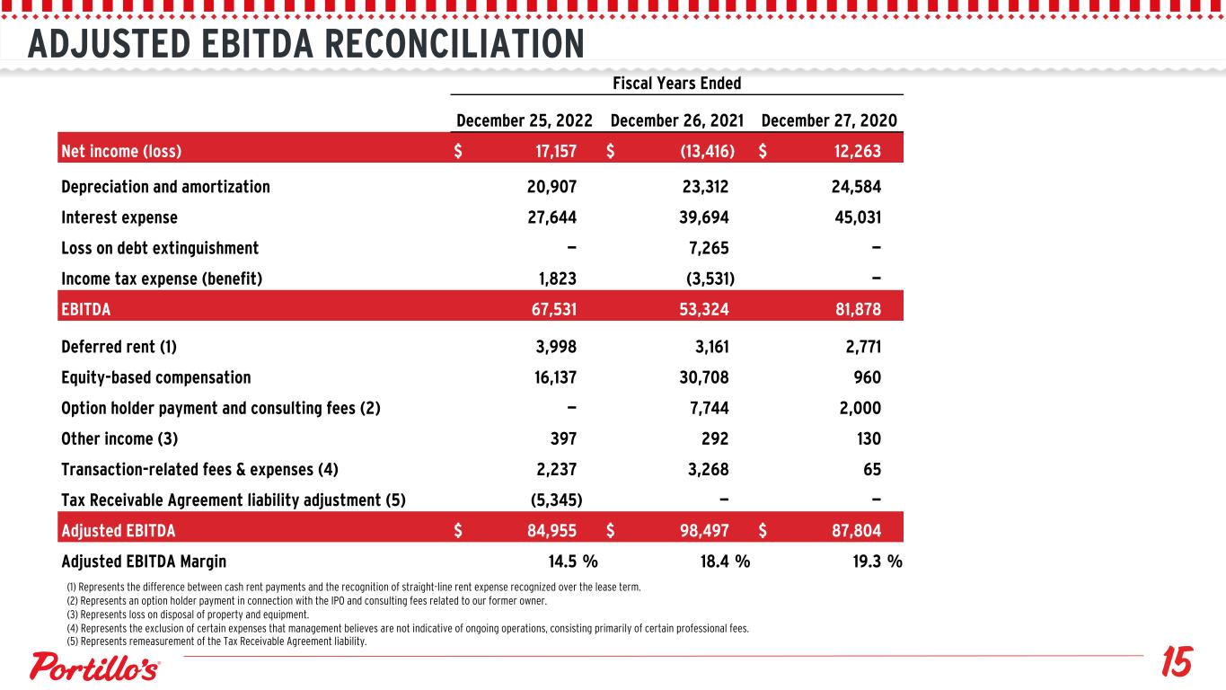 Fiscal Years Ended December 25, 2022 December 26, 2021 December 27, 2020 Net income (loss) $ 17,157 $ (13,416) $ 12,263 Depreciation and amortization 20,907 23,312 24,584 Interest expense 27,644 39,694 45,031 Loss on debt extinguishment — 7,265 — Income tax expense (benefit) 1,823 (3,531) — EBITDA 67,531 53,324 81,878 Deferred rent (1) 3,998 3,161 2,771 Equity-based compensation 16,137 30,708 960 Option holder payment and consulting fees (2) — 7,744 2,000 Other income (3) 397 292 130 Transaction-related fees & expenses (4) 2,237 3,268 65 Tax Receivable Agreement liability adjustment (5) (5,345) — — Adjusted EBITDA $ 84,955 $ 98,497 $ 87,804 Adjusted EBITDA Margin 14.5 % 18.4 % 19.3 % ADJUSTED EBITDA RECONCILIATION (1) Represents the difference between cash rent payments and the recognition of straight-line rent expense recognized over the lease term. (2) Represents an option holder payment in connection with the IPO and consulting fees related to our former owner. (3) Represents loss on disposal of property and equipment. (4) Represents the exclusion of certain expenses that management believes are not indicative of ongoing operations, consisting primarily of certain professional fees. (5) Represents remeasurement of the Tax Receivable Agreement liability.