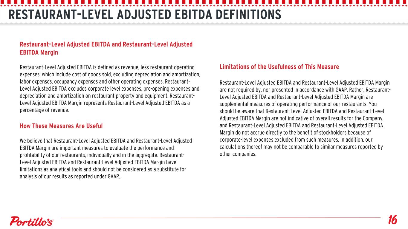 RESTAURANT-LEVEL ADJUSTED EBITDA DEFINITIONS Restaurant-Level Adjusted EBITDA and Restaurant-Level Adjusted EBITDA Margin Restaurant-Level Adjusted EBITDA is defined as revenue, less restaurant operating expenses, which include cost of goods sold, excluding depreciation and amortization, labor expenses, occupancy expenses and other operating expenses. Restaurant- Level Adjusted EBITDA excludes corporate level expenses, pre-opening expenses and depreciation and amortization on restaurant property and equipment. Restaurant- Level Adjusted EBITDA Margin represents Restaurant-Level Adjusted EBITDA as a percentage of revenue. How These Measures Are Useful We believe that Restaurant-Level Adjusted EBITDA and Restaurant-Level Adjusted EBITDA Margin are important measures to evaluate the performance and profitability of our restaurants, individually and in the aggregate. Restaurant- Level Adjusted EBITDA and Restaurant-Level Adjusted EBITDA Margin have limitations as analytical tools and should not be considered as a substitute for analysis of our results as reported under GAAP. Limitations of the Usefulness of This Measure Restaurant-Level Adjusted EBITDA and Restaurant-Level Adjusted EBITDA Margin are not required by, nor presented in accordance with GAAP. Rather, Restaurant- Level Adjusted EBITDA and Restaurant-Level Adjusted EBITDA Margin are supplemental measures of operating performance of our restaurants. You should be aware that Restaurant-Level Adjusted EBITDA and Restaurant-Level Adjusted EBITDA Margin are not indicative of overall results for the Company, and Restaurant-Level Adjusted EBITDA and Restaurant-Level Adjusted EBITDA Margin do not accrue directly to the benefit of stockholders because of corporate-level expenses excluded from such measures. In addition, our calculations thereof may not be comparable to similar measures reported by other companies.