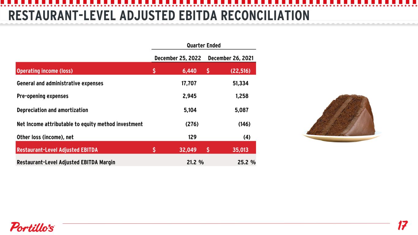 RESTAURANT-LEVEL ADJUSTED EBITDA RECONCILIATION Quarter Ended December 25, 2022 December 26, 2021 Operating income (loss) $ 6,440 $ (22,516) General and administrative expenses 17,707 51,334 Pre-opening expenses 2,945 1,258 Depreciation and amortization 5,104 5,087 Net Income attributable to equity method investment (276) (146) Other loss (income), net 129 (4) Restaurant-Level Adjusted EBITDA $ 32,049 $ 35,013 Restaurant-Level Adjusted EBITDA Margin 21.2 % 25.2 %
