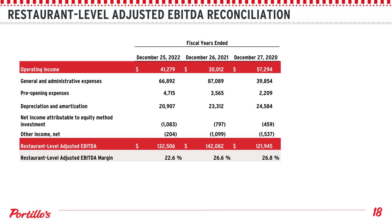 RESTAURANT-LEVEL ADJUSTED EBITDA RECONCILIATION Fiscal Years Ended December 25, 2022 December 26, 2021 December 27, 2020 Operating income $ 41,279 $ 30,012 $ 57,294 General and administrative expenses 66,892 87,089 39,854 Pre-opening expenses 4,715 3,565 2,209 Depreciation and amortization 20,907 23,312 24,584 Net Income attributable to equity method investment (1,083) (797) (459) Other income, net (204) (1,099) (1,537) Restaurant-Level Adjusted EBITDA $ 132,506 $ 142,082 $ 121,945 Restaurant-Level Adjusted EBITDA Margin 22.6 % 26.6 % 26.8 %