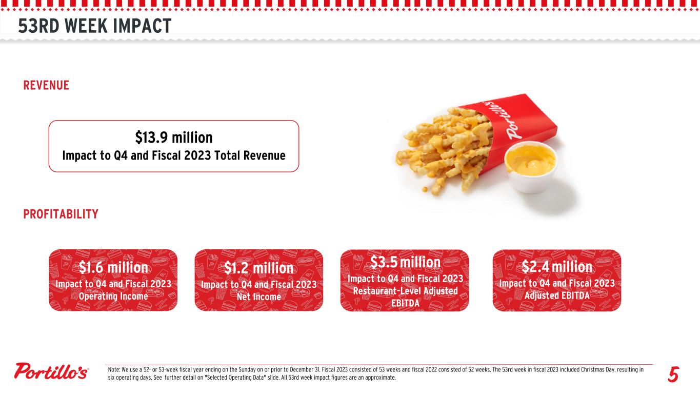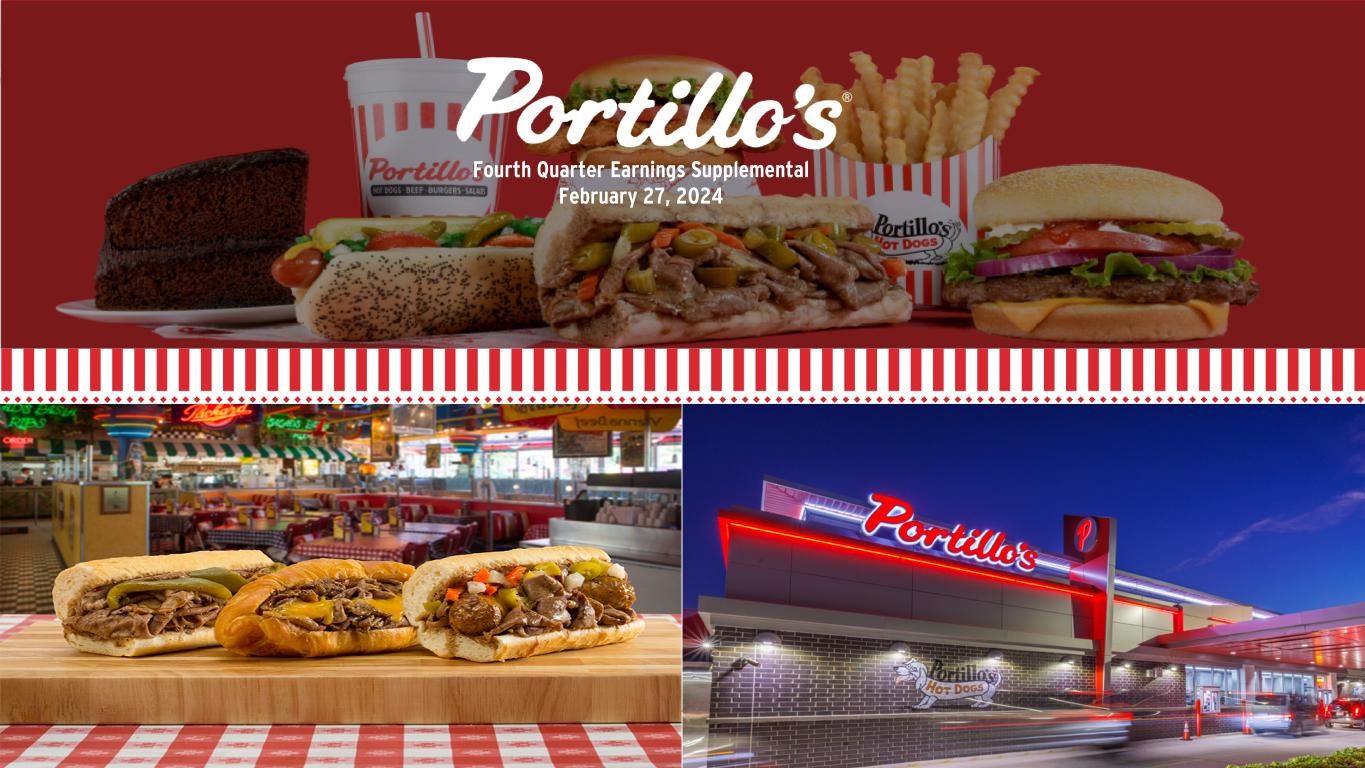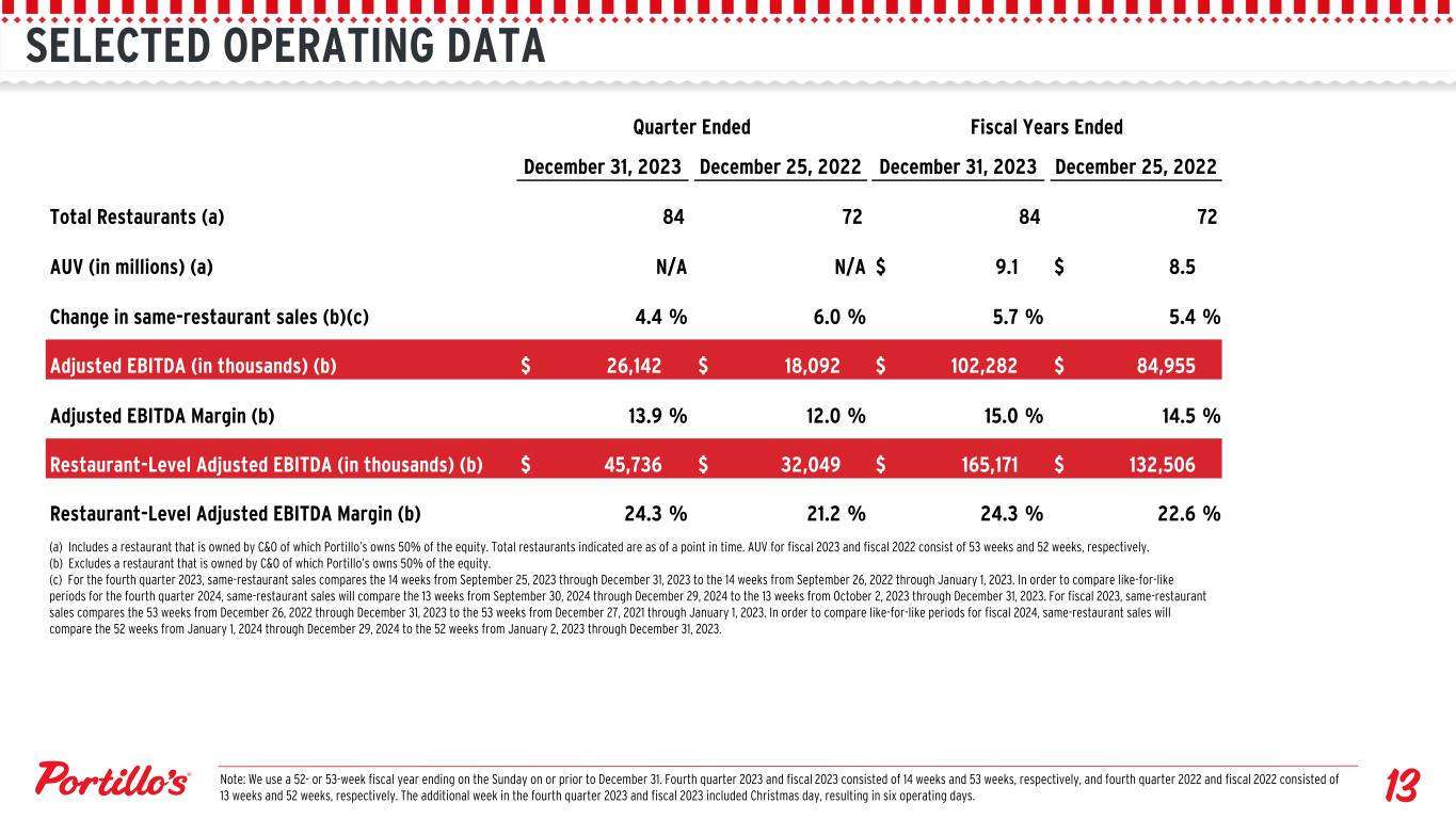 SELECTED OPERATING DATA (a) Includes a restaurant that is owned by C&O of which Portillo’s owns 50% of the equity. Total restaurants indicated are as of a point in time. AUV for fiscal 2023 and fiscal 2022 consist of 53 weeks and 52 weeks, respectively. (b) Excludes a restaurant that is owned by C&O of which Portillo’s owns 50% of the equity. (c) For the fourth quarter 2023, same-restaurant sales compares the 14 weeks from September 25, 2023 through December 31, 2023 to the 14 weeks from September 26, 2022 through January 1, 2023. In order to compare like-for-like periods for the fourth quarter 2024, same-restaurant sales will compare the 13 weeks from September 30, 2024 through December 29, 2024 to the 13 weeks from October 2, 2023 through December 31, 2023. For fiscal 2023, same-restaurant sales compares the 53 weeks from December 26, 2022 through December 31, 2023 to the 53 weeks from December 27, 2021 through January 1, 2023. In order to compare like-for-like periods for fiscal 2024, same-restaurant sales will compare the 52 weeks from January 1, 2024 through December 29, 2024 to the 52 weeks from January 2, 2023 through December 31, 2023. Quarter Ended Fiscal Years Ended December 31, 2023 December 25, 2022 December 31, 2023 December 25, 2022 Total Restaurants (a) 84 72 84 72 AUV (in millions) (a) N/A N/A $ 9.1 $ 8.5 Change in same-restaurant sales (b)(c) 4.4 % 6.0 % 5.7 % 5.4 % Adjusted EBITDA (in thousands) (b) $ 26,142 $ 18,092 $ 102,282 $ 84,955 Adjusted EBITDA Margin (b) 13.9 % 12.0 % 15.0 % 14.5 % Restaurant-Level Adjusted EBITDA (in thousands) (b) $ 45,736 $ 32,049 $ 165,171 $ 132,506 Restaurant-Level Adjusted EBITDA Margin (b) 24.3 % 21.2 % 24.3 % 22.6 % Note: We use a 52- or 53-week fiscal year ending on the Sunday on or prior to December 31. Fourth quarter 2023 and fiscal 2023 consisted of 14 weeks and 53 weeks, respectively, and fourth quarter 2022 and fiscal 2022 consisted of 13 weeks and 52 weeks, respectively. The additional week in the fourth quarter 2023 and fiscal 2023 included Christmas day, resulting in six operating days.