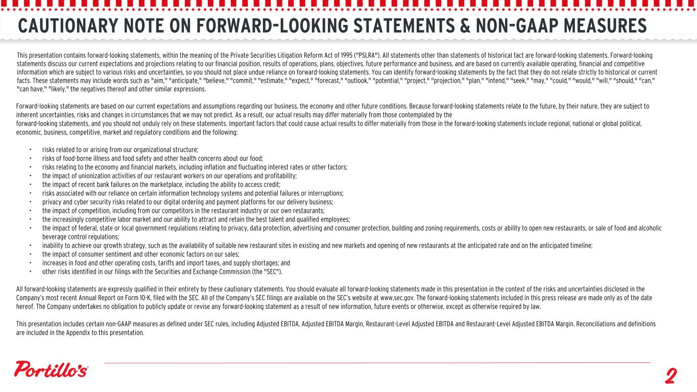 CAUTIONARY NOTE ON FORWARD-LOOKING STATEMENTS & NON-GAAP MEASURES This presentation contains forward-looking statements, within the meaning of the Private Securities Litigation Reform Act of 1995 ("PSLRA"). All statements other than statements of historical fact are forward-looking statements. Forward-looking statements discuss our current expectations and projections relating to our financial position, results of operations, plans, objectives, future performance and business, and are based on currently available operating, financial and competitive information which are subject to various risks and uncertainties, so you should not place undue reliance on forward-looking statements. You can identify forward-looking statements by the fact that they do not relate strictly to historical or current facts. These statements may include words such as "aim," "anticipate," "believe," "commit," "estimate," "expect," "forecast," "outlook," "potential," "project," "projection," "plan," "intend," "seek," "may," "could," "would," "will," "should," "can," "can have," "likely," the negatives thereof and other similar expressions. Forward-looking statements are based on our current expectations and assumptions regarding our business, the economy and other future conditions. Because forward-looking statements relate to the future, by their nature, they are subject to inherent uncertainties, risks and changes in circumstances that we may not predict. As a result, our actual results may differ materially from those contemplated by the forward-looking statements, and you should not unduly rely on these statements. Important factors that could cause actual results to differ materially from those in the forward-looking statements include regional, national or global political, economic, business, competitive, market and regulatory conditions and the following: • risks related to or arising from our organizational structure; • risks of food-borne illness and food safety and other health concerns about our food; • risks relating to the economy and financial markets, including inflation and fluctuating interest rates or other factors; • the impact of unionization activities of our restaurant workers on our operations and profitability; • the impact of recent bank failures on the marketplace, including the ability to access credit; • risks associated with our reliance on certain information technology systems and potential failures or interruptions; • privacy and cyber security risks related to our digital ordering and payment platforms for our delivery business; • the impact of competition, including from our competitors in the restaurant industry or our own restaurants; • the increasingly competitive labor market and our ability to attract and retain the best talent and qualified employees; • the impact of federal, state or local government regulations relating to privacy, data protection, advertising and consumer protection, building and zoning requirements, costs or ability to open new restaurants, or sale of food and alcoholic beverage control regulations; • inability to achieve our growth strategy, such as the availability of suitable new restaurant sites in existing and new markets and opening of new restaurants at the anticipated rate and on the anticipated timeline; • the impact of consumer sentiment and other economic factors on our sales; • increases in food and other operating costs, tariffs and import taxes, and supply shortages; and • other risks identified in our filings with the Securities and Exchange Commission (the "SEC"). All forward-looking statements are expressly qualified in their entirety by these cautionary statements. You should evaluate all forward-looking statements made in this presentation in the context of the risks and uncertainties disclosed in the Company’s most recent Annual Report on Form 10-K, filed with the SEC. All of the Company’s SEC filings are available on the SEC’s website at www.sec.gov. The forward-looking statements included in this press release are made only as of the date hereof. The Company undertakes no obligation to publicly update or revise any forward-looking statement as a result of new information, future events or otherwise, except as otherwise required by law. This presentation includes certain non-GAAP measures as defined under SEC rules, including Adjusted EBITDA, Adjusted EBITDA Margin, Restaurant-Level Adjusted EBITDA and Restaurant-Level Adjusted EBITDA Margin. Reconciliations and definitions are included in the Appendix to this presentation.