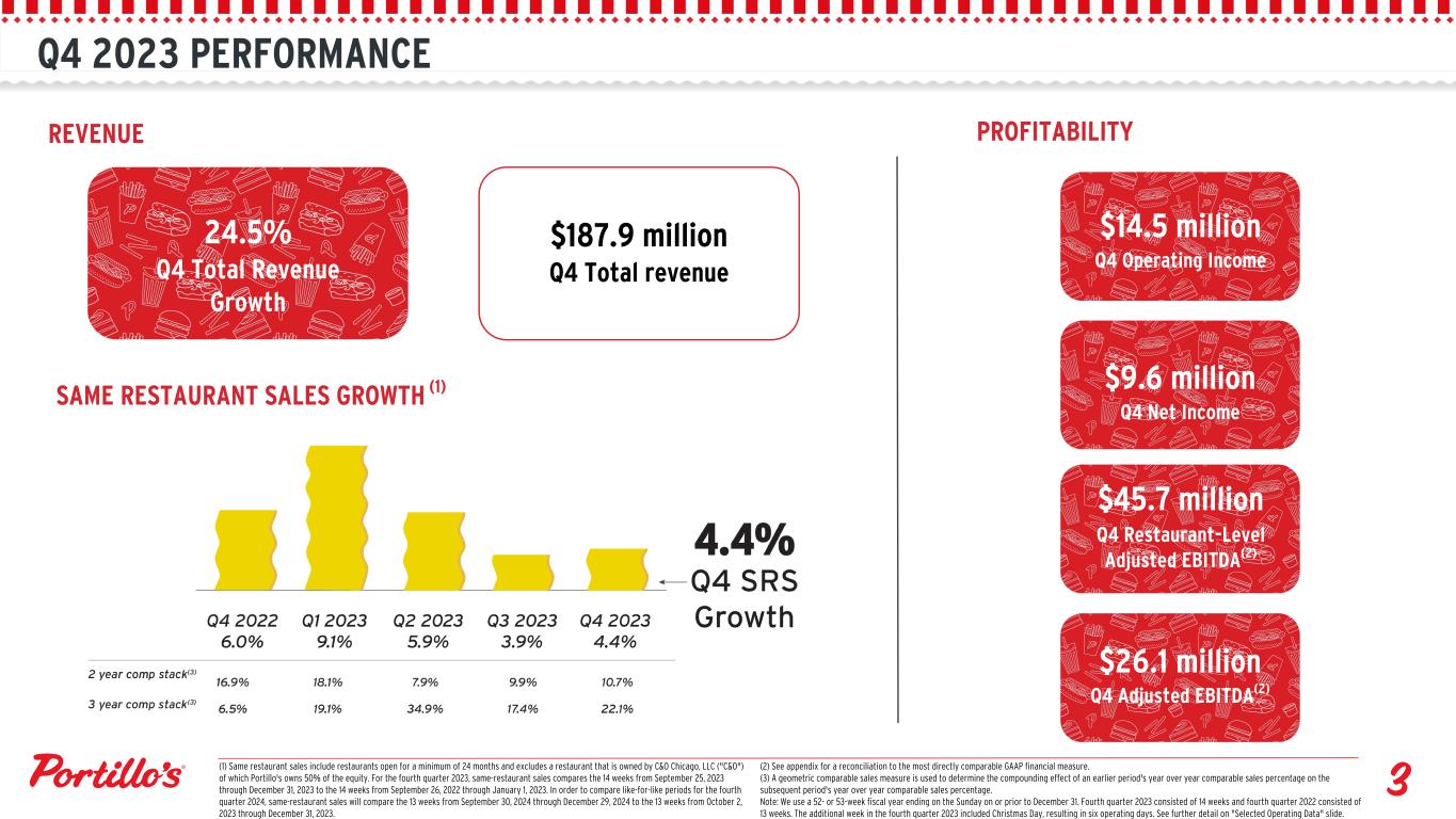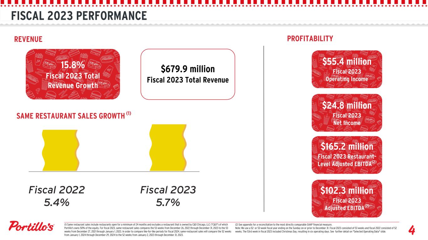 Q4 2023 PERFORMANCE REVENUE $187.9 million Q4 Total revenue SAME RESTAURANT SALES GROWTH (1) PROFITABILITY $14.5 million Q4 Operating Income 24.5% Q4 Total Revenue Growth (2) See appendix for a reconciliation to the most directly comparable GAAP financial measure. (3) A geometric comparable sales measure is used to determine the compounding effect of an earlier period's year over year comparable sales percentage on the subsequent period's year over year comparable sales percentage. Note: We use a 52- or 53-week fiscal year ending on the Sunday on or prior to December 31. Fourth quarter 2023 consisted of 14 weeks and fourth quarter 2022 consisted of 13 weeks. The additional week in the fourth quarter 2023 included Christmas Day, resulting in six operating days. See further detail on "Selected Operating Data" slide. $26.1 million Q4 Adjusted EBITDA(2) $45.7 million Q4 Restaurant-Level Adjusted EBITDA(2) $9.6 million Q4 Net Income (1) Same restaurant sales include restaurants open for a minimum of 24 months and excludes a restaurant that is owned by C&O Chicago, LLC ("C&O") of which Portillo's owns 50% of the equity. For the fourth quarter 2023, same-restaurant sales compares the 14 weeks from September 25, 2023 through December 31, 2023 to the 14 weeks from September 26, 2022 through January 1, 2023. In order to compare like-for-like periods for the fourth quarter 2024, same-restaurant sales will compare the 13 weeks from September 30, 2024 through December 29, 2024 to the 13 weeks from October 2, 2023 through December 31, 2023.