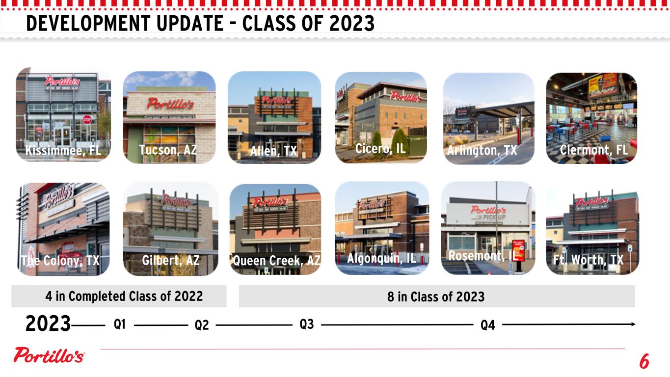FISCAL 2023 PERFORMANCE REVENUE $679.9 million Fiscal 2023 Total Revenue SAME RESTAURANT SALES GROWTH (1) PROFITABILITY $55.4 million Fiscal 2023 Operating Income 15.8% Fiscal 2023 Total Revenue Growth (2) See appendix for a reconciliation to the most directly comparable GAAP financial measure. Note: We use a 52- or 53-week fiscal year ending on the Sunday on or prior to December 31. Fiscal 2023 consisted of 53 weeks and fiscal 2022 consisted of 52 weeks. The 53rd week in fiscal 2023 included Christmas Day, resulting in six operating days. See further detail on "Selected Operating Data" slide. $102.3 million Fiscal 2023 Adjusted EBITDA(2) $165.2 million Fiscal 2023 Restaurant- Level Adjusted EBITDA(2) $24.8 million Fiscal 2023 Net Income (1) Same restaurant sales include restaurants open for a minimum of 24 months and excludes a restaurant that is owned by C&O Chicago, LLC ("C&O") of which Portillo's owns 50% of the equity. For fiscal 2023, same-restaurant sales compares the 53 weeks from December 26, 2022 through December 31, 2023 to the 53 weeks from December 27, 2021 through January 1, 2023. In order to compare like-for-like periods for fiscal 2024, same-restaurant sales will compare the 52 weeks from January 1, 2024 through December 29, 2024 to the 52 weeks from January 2, 2023 through December 31, 2023.