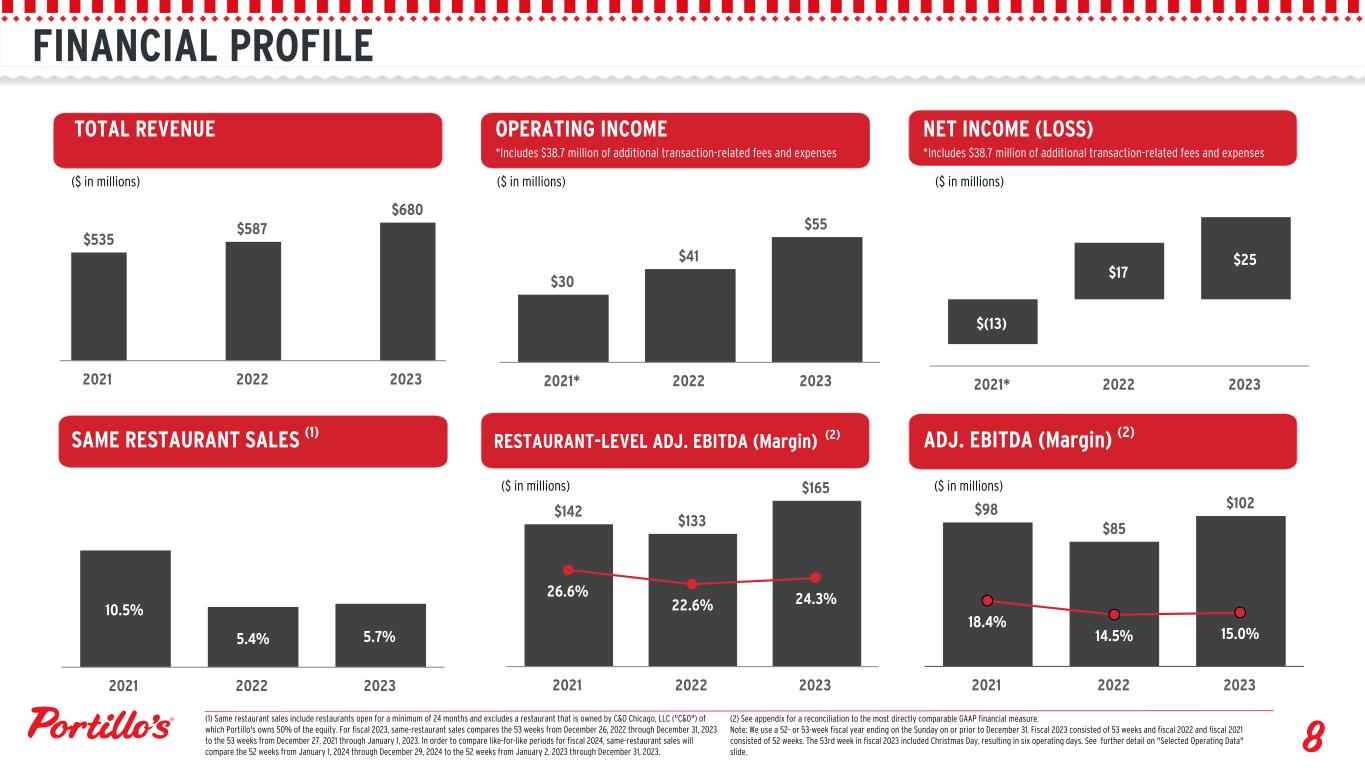 FINANCIAL PROFILE $30 $41 $55 2021* 2022 2023 $142 $133 $165 26.6% 22.6% 24.3% 2021 2022 2023 $(13) $17 $25 2021* 2022 2023 $98 $85 $102 18.4% 14.5% 15.0% 2021 2022 2023 $535 $587 $680 2021 2022 2023 10.5% 5.4% 5.7% 2021 2022 2023 TOTAL REVENUE OPERATING INCOME NET INCOME (LOSS) *Includes $38.7 million of additional transaction-related fees and expenses *Includes $38.7 million of additional transaction-related fees and expenses SAME RESTAURANT SALES (1) RESTAURANT-LEVEL ADJ. EBITDA (Margin) (2) ADJ. EBITDA (Margin) (2) ($ in millions) ($ in millions) ($ in millions) ($ in millions) ($ in millions) (1) Same restaurant sales include restaurants open for a minimum of 24 months and excludes a restaurant that is owned by C&O Chicago, LLC ("C&O") of which Portillo's owns 50% of the equity. For fiscal 2023, same-restaurant sales compares the 53 weeks from December 26, 2022 through December 31, 2023 to the 53 weeks from December 27, 2021 through January 1, 2023. In order to compare like-for-like periods for fiscal 2024, same-restaurant sales will compare the 52 weeks from January 1, 2024 through December 29, 2024 to the 52 weeks from January 2, 2023 through December 31, 2023. (2) See appendix for a reconciliation to the most directly comparable GAAP financial measure. Note: We use a 52- or 53-week fiscal year ending on the Sunday on or prior to December 31. Fiscal 2023 consisted of 53 weeks and fiscal 2022 and fiscal 2021 consisted of 52 weeks. The 53rd week in fiscal 2023 included Christmas Day, resulting in six operating days. See further detail on "Selected Operating Data" slide.