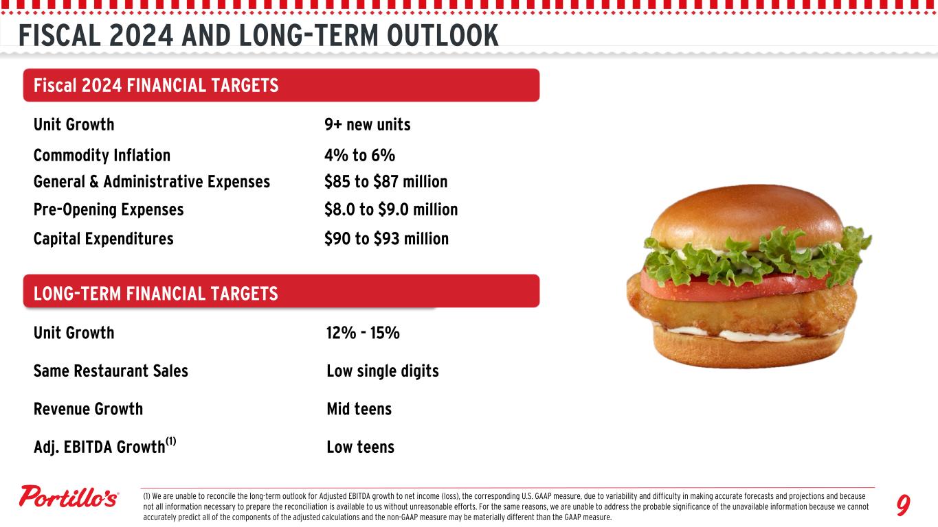 FISCAL 2024 AND LONG-TERM OUTLOOK (1) We are unable to reconcile the long-term outlook for Adjusted EBITDA growth to net income (loss), the corresponding U.S. GAAP measure, due to variability and difficulty in making accurate forecasts and projections and because not all information necessary to prepare the reconciliation is available to us without unreasonable efforts. For the same reasons, we are unable to address the probable significance of the unavailable information because we cannot accurately predict all of the components of the adjusted calculations and the non-GAAP measure may be materially different than the GAAP measure. Fiscal 2024 FINANCIAL TARGETS Unit Growth 9+ new units Commodity Inflation 4% to 6% General & Administrative Expenses $85 to $87 million Pre-Opening Expenses $8.0 to $9.0 million Capital Expenditures $90 to $93 million LONG-TERM FINANCIAL TARGETS Unit Growth 12% - 15% Same Restaurant Sales Low single digits Revenue Growth Mid teens Adj. EBITDA Growth(1) Low teens
