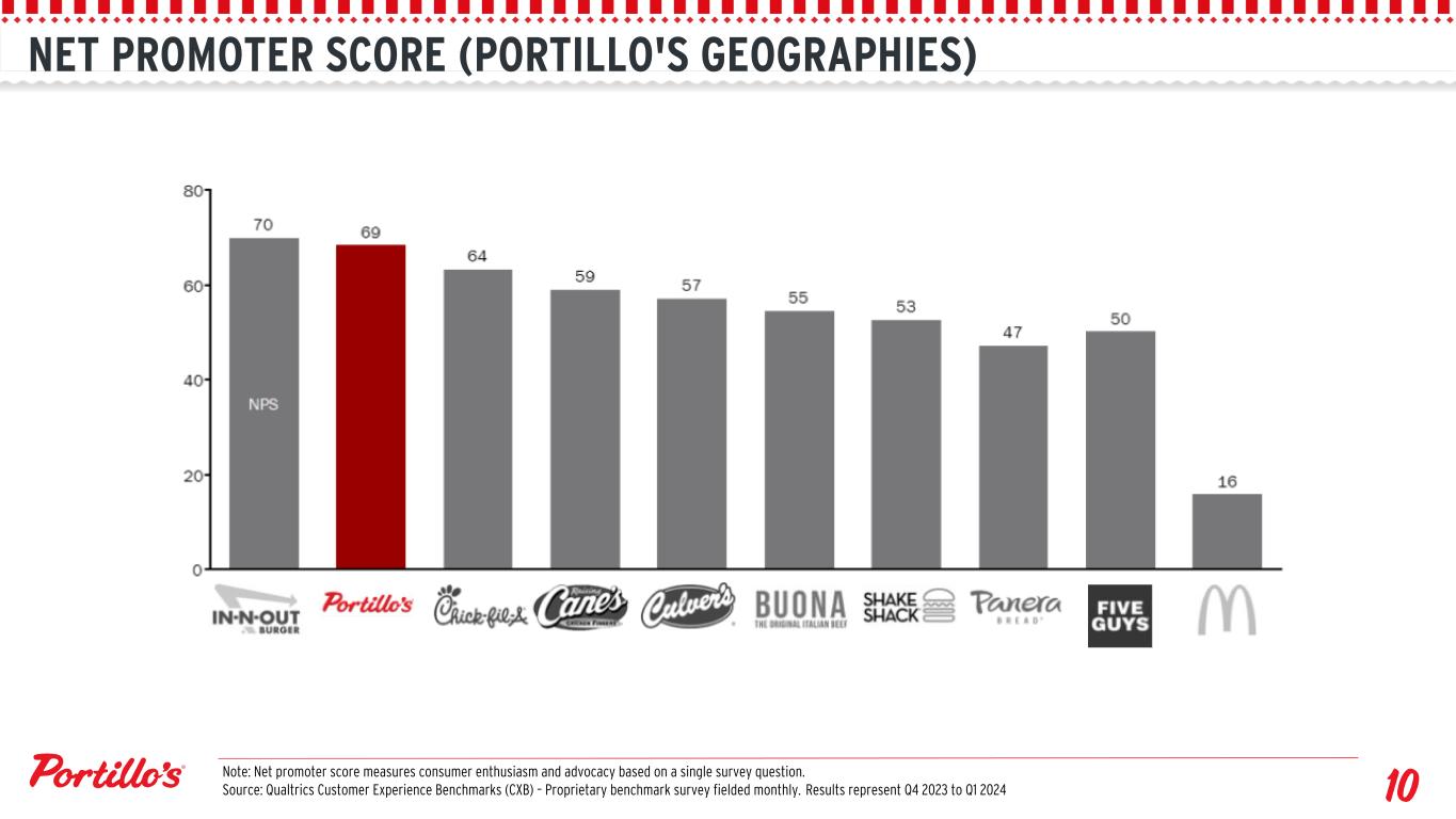NET PROMOTER SCORE (PORTILLO'S GEOGRAPHIES) Note: Net promoter score measures consumer enthusiasm and advocacy based on a single survey question. Source: Qualtrics Customer Experience Benchmarks (CXB) – Proprietary benchmark survey fielded monthly.  Results represent Q4 2023 to Q1 2024