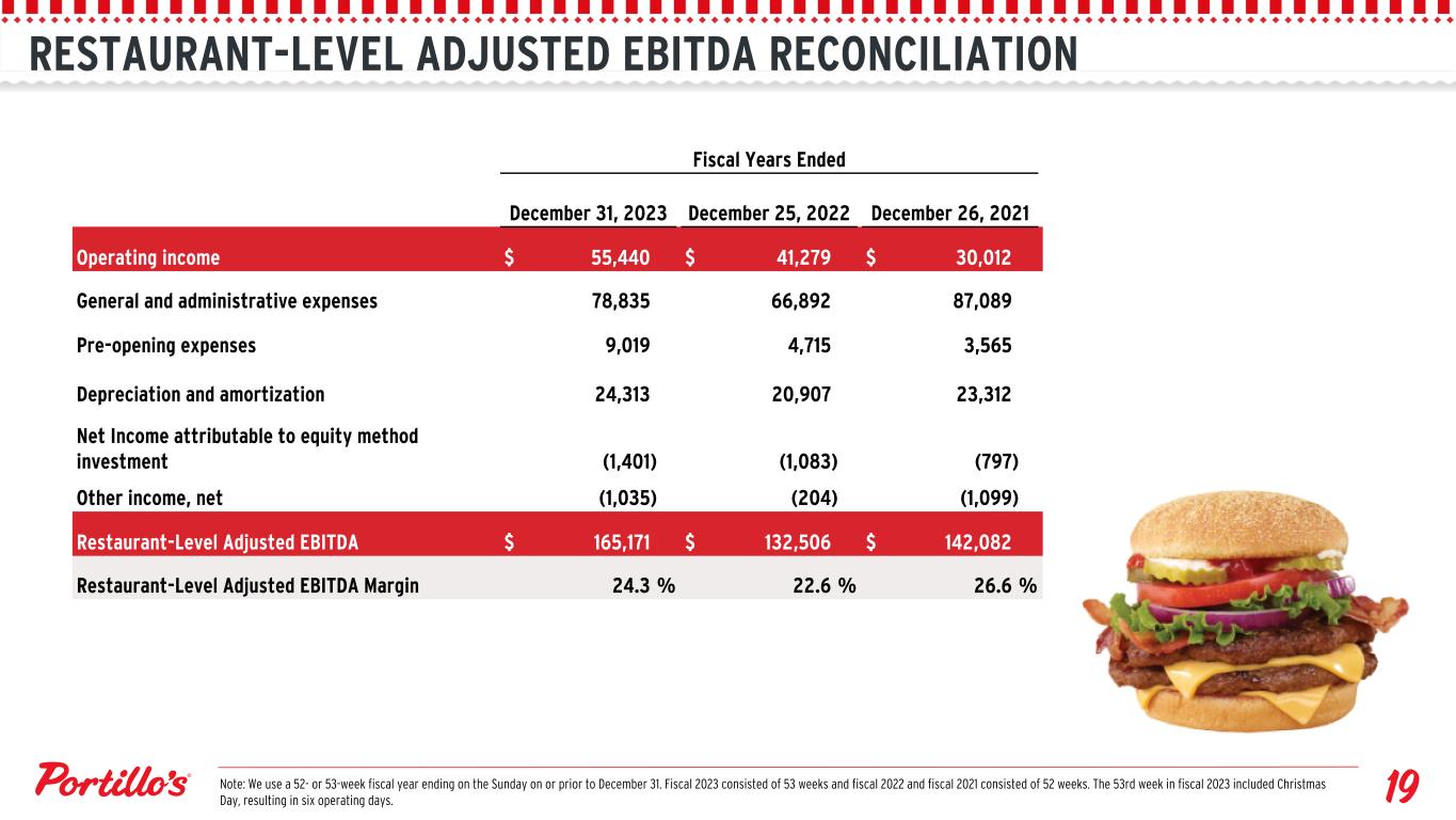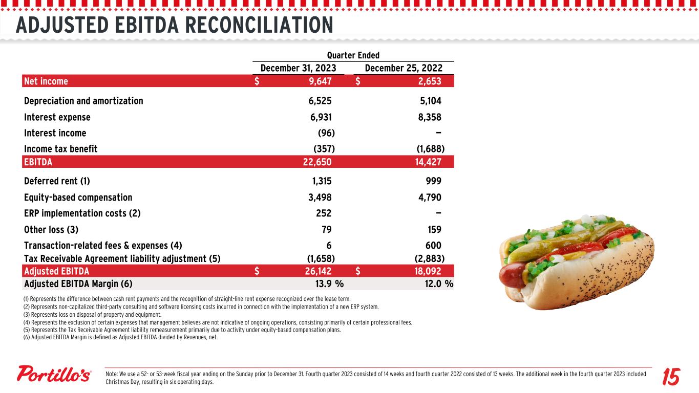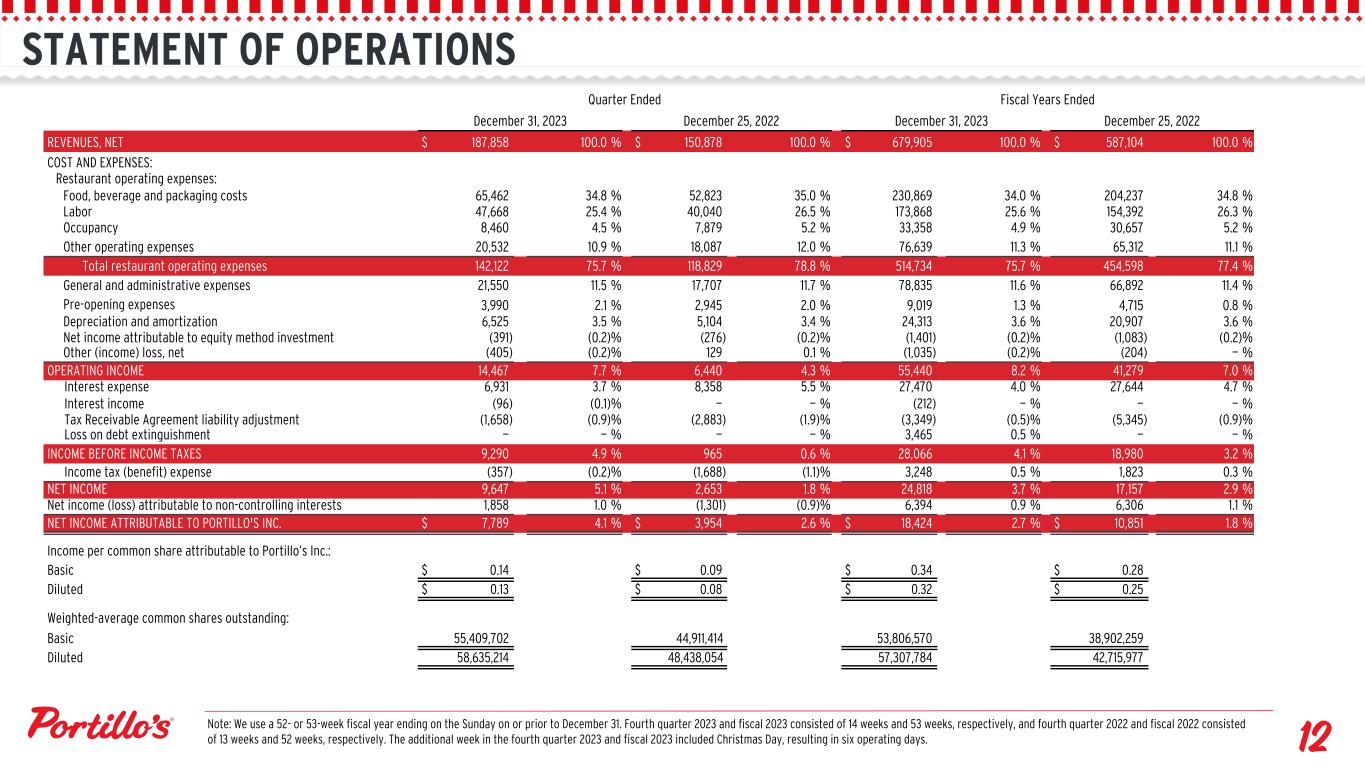 STATEMENT OF OPERATIONS Quarter Ended Fiscal Years Ended December 31, 2023 December 25, 2022 December 31, 2023 December 25, 2022 REVENUES, NET $ 187,858 100.0 % $ 150,878 100.0 % $ 679,905 100.0 % $ 587,104 100.0 % COST AND EXPENSES: Restaurant operating expenses: Food, beverage and packaging costs 65,462 34.8 % 52,823 35.0 % 230,869 34.0 % 204,237 34.8 % Labor 47,668 25.4 % 40,040 26.5 % 173,868 25.6 % 154,392 26.3 % Occupancy 8,460 4.5 % 7,879 5.2 % 33,358 4.9 % 30,657 5.2 % Other operating expenses 20,532 10.9 % 18,087 12.0 % 76,639 11.3 % 65,312 11.1 % Total restaurant operating expenses 142,122 75.7 % 118,829 78.8 % 514,734 75.7 % 454,598 77.4 % General and administrative expenses 21,550 11.5 % 17,707 11.7 % 78,835 11.6 % 66,892 11.4 % Pre-opening expenses 3,990 2.1 % 2,945 2.0 % 9,019 1.3 % 4,715 0.8 % Depreciation and amortization 6,525 3.5 % 5,104 3.4 % 24,313 3.6 % 20,907 3.6 % Net income attributable to equity method investment (391) (0.2) % (276) (0.2) % (1,401) (0.2) % (1,083) (0.2) % Other (income) loss, net (405) (0.2) % 129 0.1 % (1,035) (0.2) % (204) — % OPERATING INCOME 14,467 7.7 % 6,440 4.3 % 55,440 8.2 % 41,279 7.0 % Interest expense 6,931 3.7 % 8,358 5.5 % 27,470 4.0 % 27,644 4.7 % Interest income (96) (0.1) % — — % (212) — % — — % Tax Receivable Agreement liability adjustment (1,658) (0.9) % (2,883) (1.9) % (3,349) (0.5) % (5,345) (0.9) % Loss on debt extinguishment — — % — — % 3,465 0.5 % — — % INCOME BEFORE INCOME TAXES 9,290 4.9 % 965 0.6 % 28,066 4.1 % 18,980 3.2 % Income tax (benefit) expense (357) (0.2) % (1,688) (1.1) % 3,248 0.5 % 1,823 0.3 % NET INCOME 9,647 5.1 % 2,653 1.8 % 24,818 3.7 % 17,157 2.9 % Net income (loss) attributable to non-controlling interests 1,858 1.0 % (1,301) (0.9) % 6,394 0.9 % 6,306 1.1 % NET INCOME ATTRIBUTABLE TO PORTILLO'S INC. $ 7,789 4.1 % $ 3,954 2.6 % $ 18,424 2.7 % $ 10,851 1.8 % Income per common share attributable to Portillo’s Inc.: Basic $ 0.14 $ 0.09 $ 0.34 $ 0.28 Diluted $ 0.13 $ 0.08 $ 0.32 $ 0.25 Weighted-average common shares outstanding: Basic 55,409,702 44,911,414 53,806,570 38,902,259 Diluted 58,635,214 48,438,054 57,307,784 42,715,977 Note: We use a 52- or 53-week fiscal year ending on the Sunday on or prior to December 31. Fourth quarter 2023 and fiscal 2023 consisted of 14 weeks and 53 weeks, respectively, and fourth quarter 2022 and fiscal 2022 consisted of 13 weeks and 52 weeks, respectively. The additional week in the fourth quarter 2023 and fiscal 2023 included Christmas Day, resulting in six operating days.