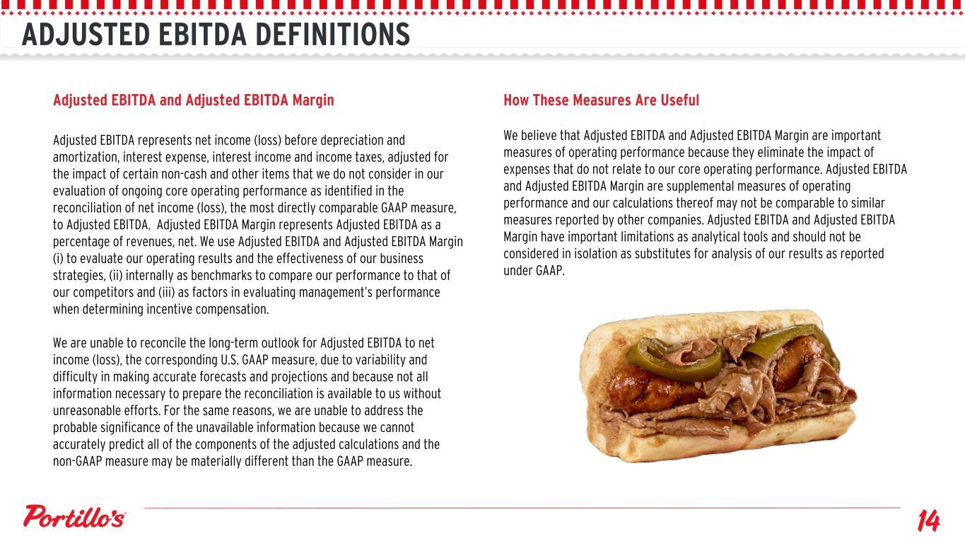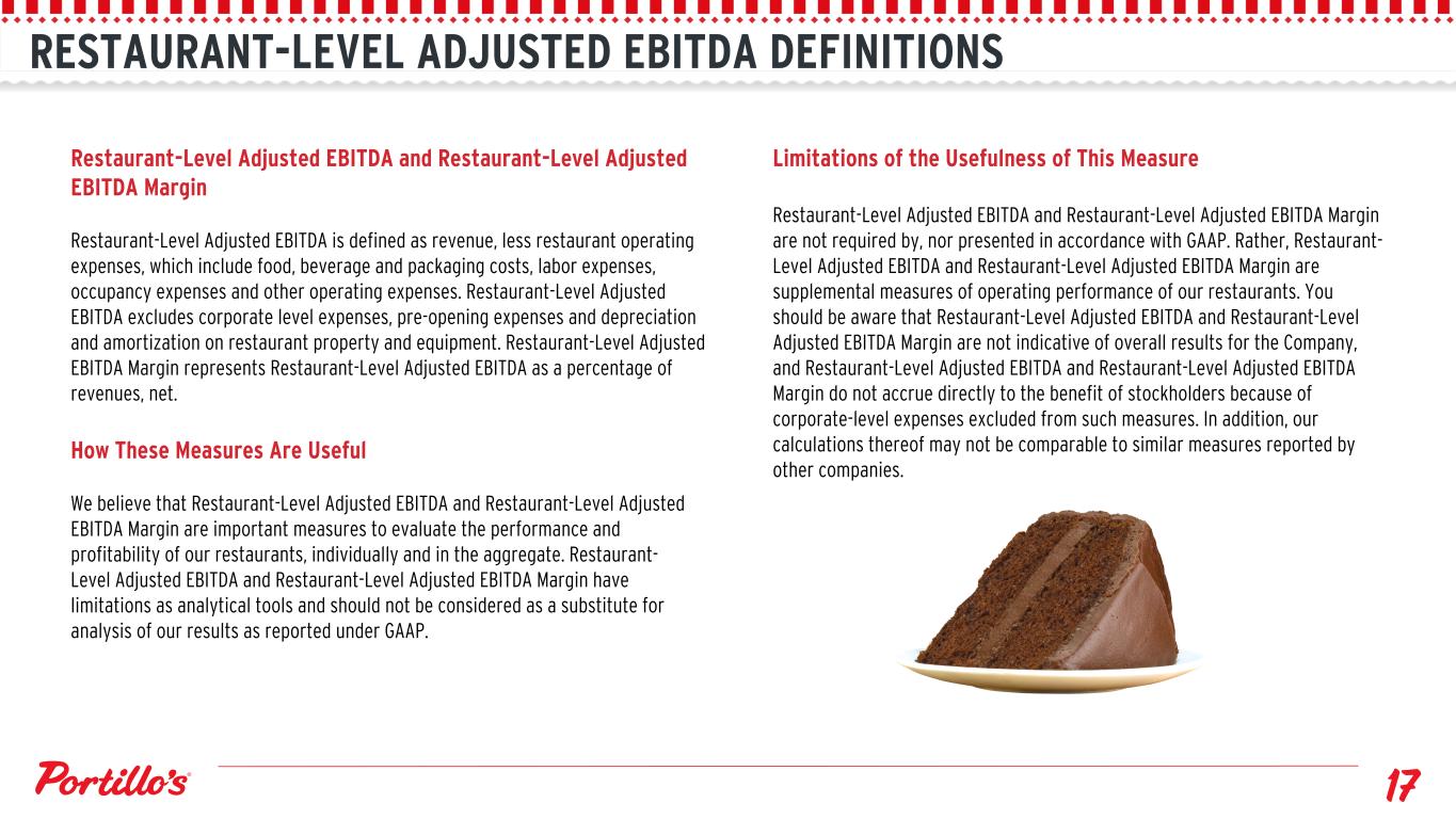 RESTAURANT-LEVEL ADJUSTED EBITDA DEFINITIONS Restaurant-Level Adjusted EBITDA and Restaurant-Level Adjusted EBITDA Margin Restaurant-Level Adjusted EBITDA is defined as revenue, less restaurant operating expenses, which include food, beverage and packaging costs, labor expenses, occupancy expenses and other operating expenses. Restaurant-Level Adjusted EBITDA excludes corporate level expenses, pre-opening expenses and depreciation and amortization on restaurant property and equipment. Restaurant-Level Adjusted EBITDA Margin represents Restaurant-Level Adjusted EBITDA as a percentage of revenues, net. How These Measures Are Useful We believe that Restaurant-Level Adjusted EBITDA and Restaurant-Level Adjusted EBITDA Margin are important measures to evaluate the performance and profitability of our restaurants, individually and in the aggregate. Restaurant- Level Adjusted EBITDA and Restaurant-Level Adjusted EBITDA Margin have limitations as analytical tools and should not be considered as a substitute for analysis of our results as reported under GAAP. Limitations of the Usefulness of This Measure Restaurant-Level Adjusted EBITDA and Restaurant-Level Adjusted EBITDA Margin are not required by, nor presented in accordance with GAAP. Rather, Restaurant- Level Adjusted EBITDA and Restaurant-Level Adjusted EBITDA Margin are supplemental measures of operating performance of our restaurants. You should be aware that Restaurant-Level Adjusted EBITDA and Restaurant-Level Adjusted EBITDA Margin are not indicative of overall results for the Company, and Restaurant-Level Adjusted EBITDA and Restaurant-Level Adjusted EBITDA Margin do not accrue directly to the benefit of stockholders because of corporate-level expenses excluded from such measures. In addition, our calculations thereof may not be comparable to similar measures reported by other companies.
