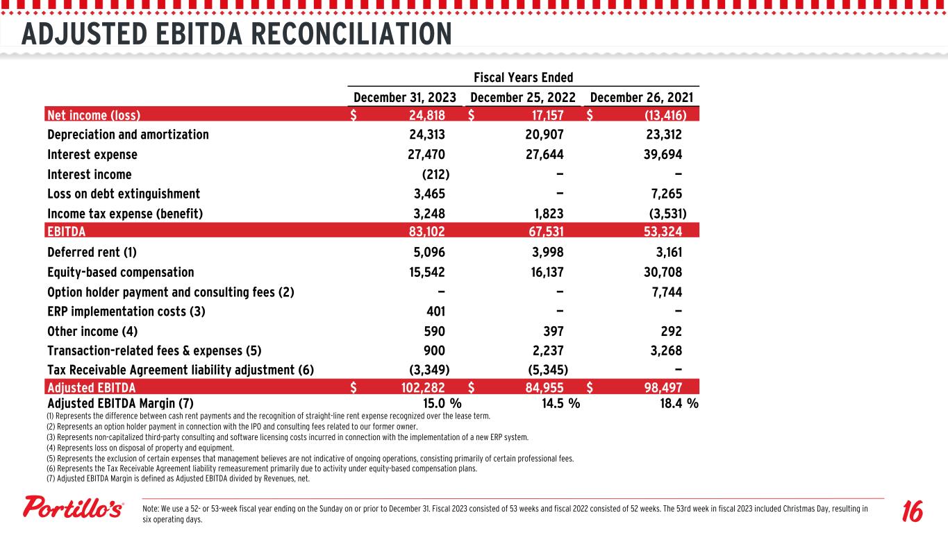Fiscal Years Ended December 31, 2023 December 25, 2022 December 26, 2021 Net income (loss) $ 24,818 $ 17,157 $ (13,416) Depreciation and amortization 24,313 20,907 23,312 Interest expense 27,470 27,644 39,694 Interest income (212) — — Loss on debt extinguishment 3,465 — 7,265 Income tax expense (benefit) 3,248 1,823 (3,531) EBITDA 83,102 67,531 53,324 Deferred rent (1) 5,096 3,998 3,161 Equity-based compensation 15,542 16,137 30,708 Option holder payment and consulting fees (2) — — 7,744 ERP implementation costs (3) 401 — — Other income (4) 590 397 292 Transaction-related fees & expenses (5) 900 2,237 3,268 Tax Receivable Agreement liability adjustment (6) (3,349) (5,345) — Adjusted EBITDA $ 102,282 $ 84,955 $ 98,497 Adjusted EBITDA Margin (7) 15.0 % 14.5 % 18.4 % ADJUSTED EBITDA RECONCILIATION (1) Represents the difference between cash rent payments and the recognition of straight-line rent expense recognized over the lease term. (2) Represents an option holder payment in connection with the IPO and consulting fees related to our former owner. (3) Represents non-capitalized third-party consulting and software licensing costs incurred in connection with the implementation of a new ERP system. (4) Represents loss on disposal of property and equipment. (5) Represents the exclusion of certain expenses that management believes are not indicative of ongoing operations, consisting primarily of certain professional fees. (6) Represents the Tax Receivable Agreement liability remeasurement primarily due to activity under equity-based compensation plans. (7) Adjusted EBITDA Margin is defined as Adjusted EBITDA divided by Revenues, net. Note: We use a 52- or 53-week fiscal year ending on the Sunday on or prior to December 31. Fiscal 2023 consisted of 53 weeks and fiscal 2022 consisted of 52 weeks. The 53rd week in fiscal 2023 included Christmas Day, resulting in six operating days.