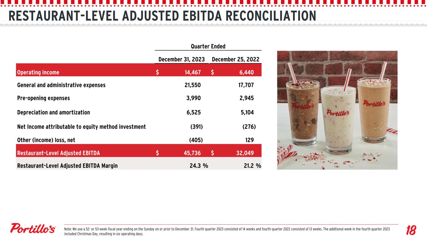 RESTAURANT-LEVEL ADJUSTED EBITDA RECONCILIATION Quarter Ended December 31, 2023 December 25, 2022 Operating income $ 14,467 $ 6,440 General and administrative expenses 21,550 17,707 Pre-opening expenses 3,990 2,945 Depreciation and amortization 6,525 5,104 Net Income attributable to equity method investment (391) (276) Other (income) loss, net (405) 129 Restaurant-Level Adjusted EBITDA $ 45,736 $ 32,049 Restaurant-Level Adjusted EBITDA Margin 24.3 % 21.2 % Note: We use a 52- or 53-week fiscal year ending on the Sunday on or prior to December 31. Fourth quarter 2023 consisted of 14 weeks and fourth quarter 2022 consisted of 13 weeks. The additional week in the fourth quarter 2023 included Christmas Day, resulting in six operating days.