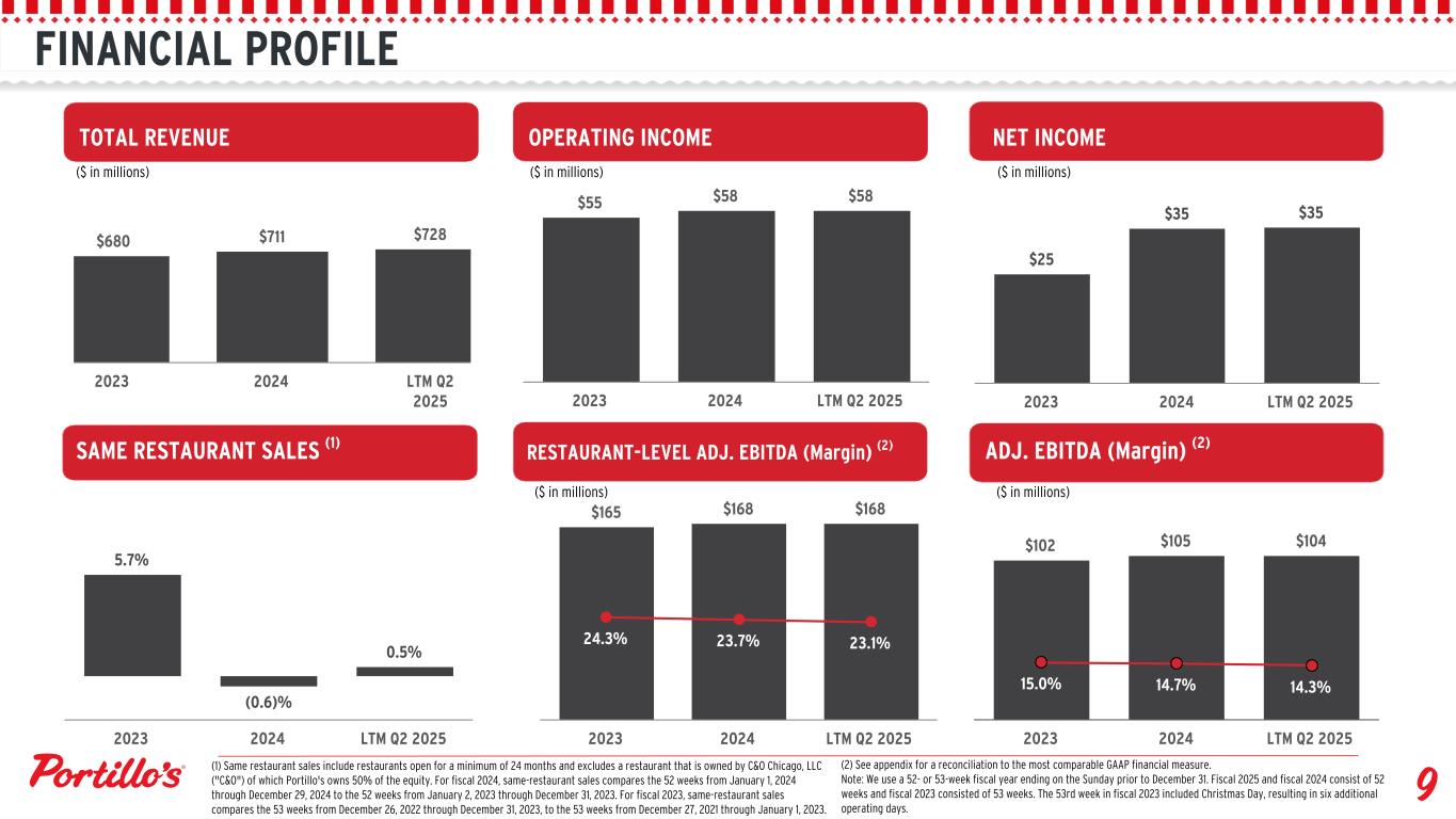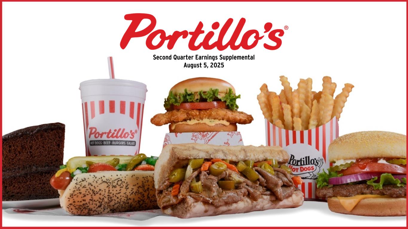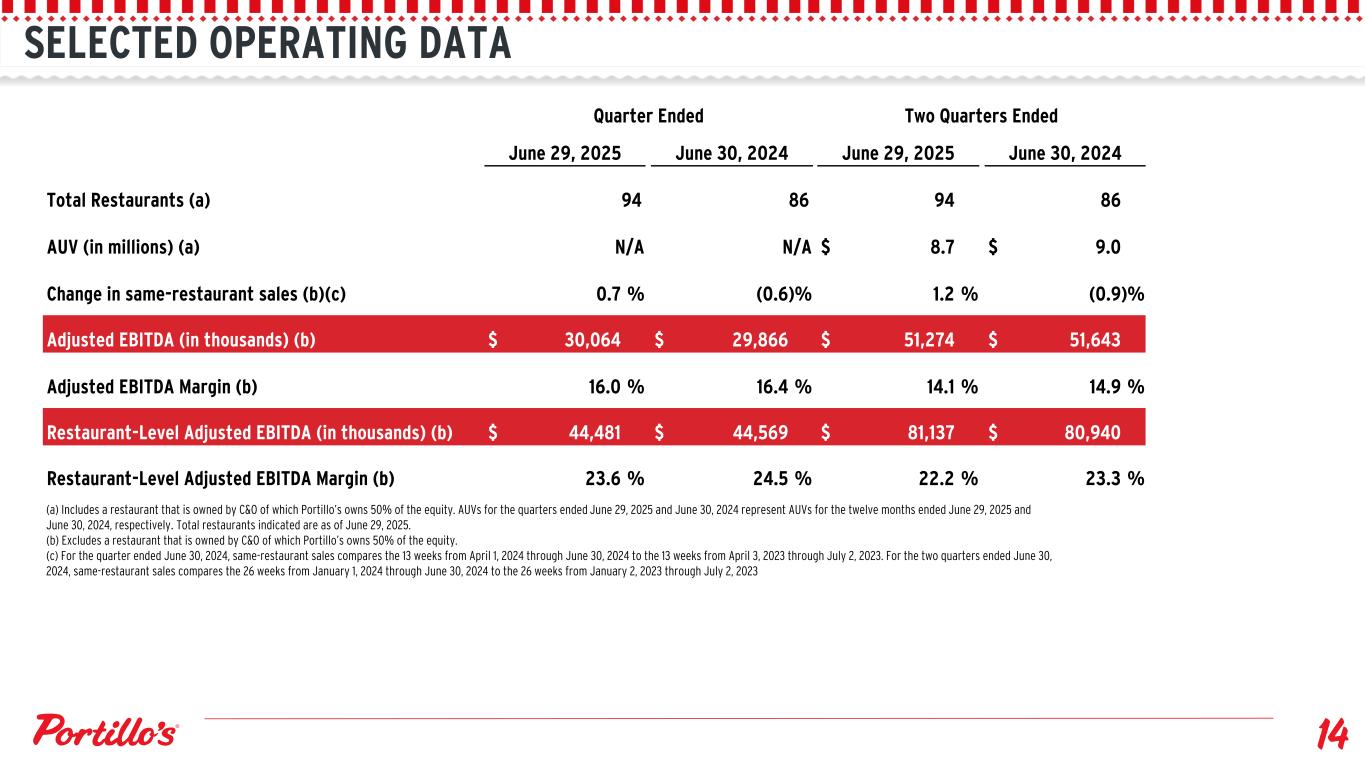 SELECTED OPERATING DATA (a) Includes a restaurant that is owned by C&O of which Portillo’s owns 50% of the equity. AUVs for the quarters ended June 29, 2025 and June 30, 2024 represent AUVs for the twelve months ended June 29, 2025 and June 30, 2024, respectively. Total restaurants indicated are as of June 29, 2025. (b) Excludes a restaurant that is owned by C&O of which Portillo’s owns 50% of the equity. (c) For the quarter ended June 30, 2024, same-restaurant sales compares the 13 weeks from April 1, 2024 through June 30, 2024 to the 13 weeks from April 3, 2023 through July 2, 2023. For the two quarters ended June 30, 2024, same-restaurant sales compares the 26 weeks from January 1, 2024 through June 30, 2024 to the 26 weeks from January 2, 2023 through July 2, 2023 Quarter Ended Two Quarters Ended June 29, 2025 June 30, 2024 June 29, 2025 June 30, 2024 Total Restaurants (a) 94 86 94 86 AUV (in millions) (a) N/A N/A $ 8.7 $ 9.0 Change in same-restaurant sales (b)(c) 0.7 % (0.6) % 1.2 % (0.9) % Adjusted EBITDA (in thousands) (b) $ 30,064 $ 29,866 $ 51,274 $ 51,643 Adjusted EBITDA Margin (b) 16.0 % 16.4 % 14.1 % 14.9 % Restaurant-Level Adjusted EBITDA (in thousands) (b) $ 44,481 $ 44,569 $ 81,137 $ 80,940 Restaurant-Level Adjusted EBITDA Margin (b) 23.6 % 24.5 % 22.2 % 23.3 %